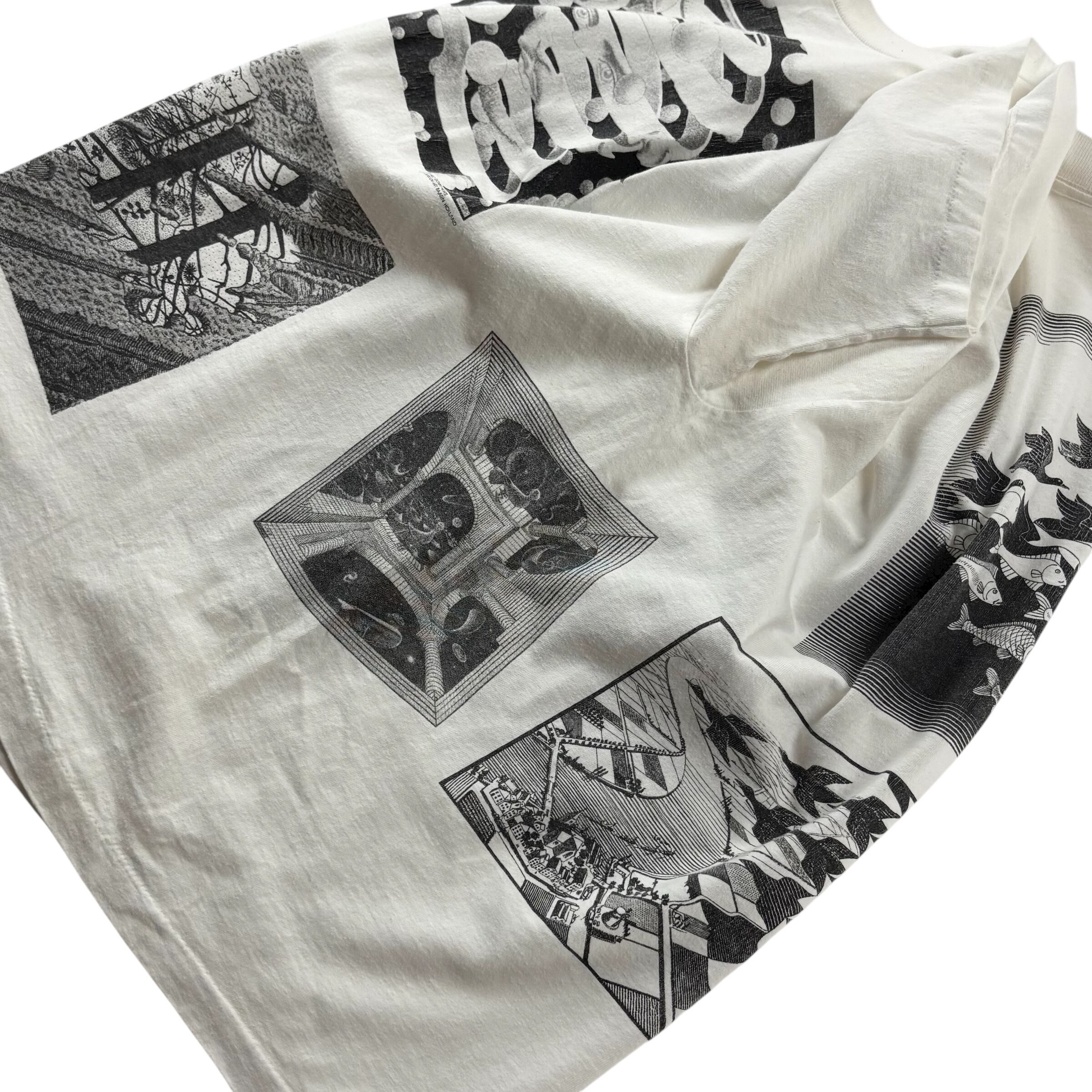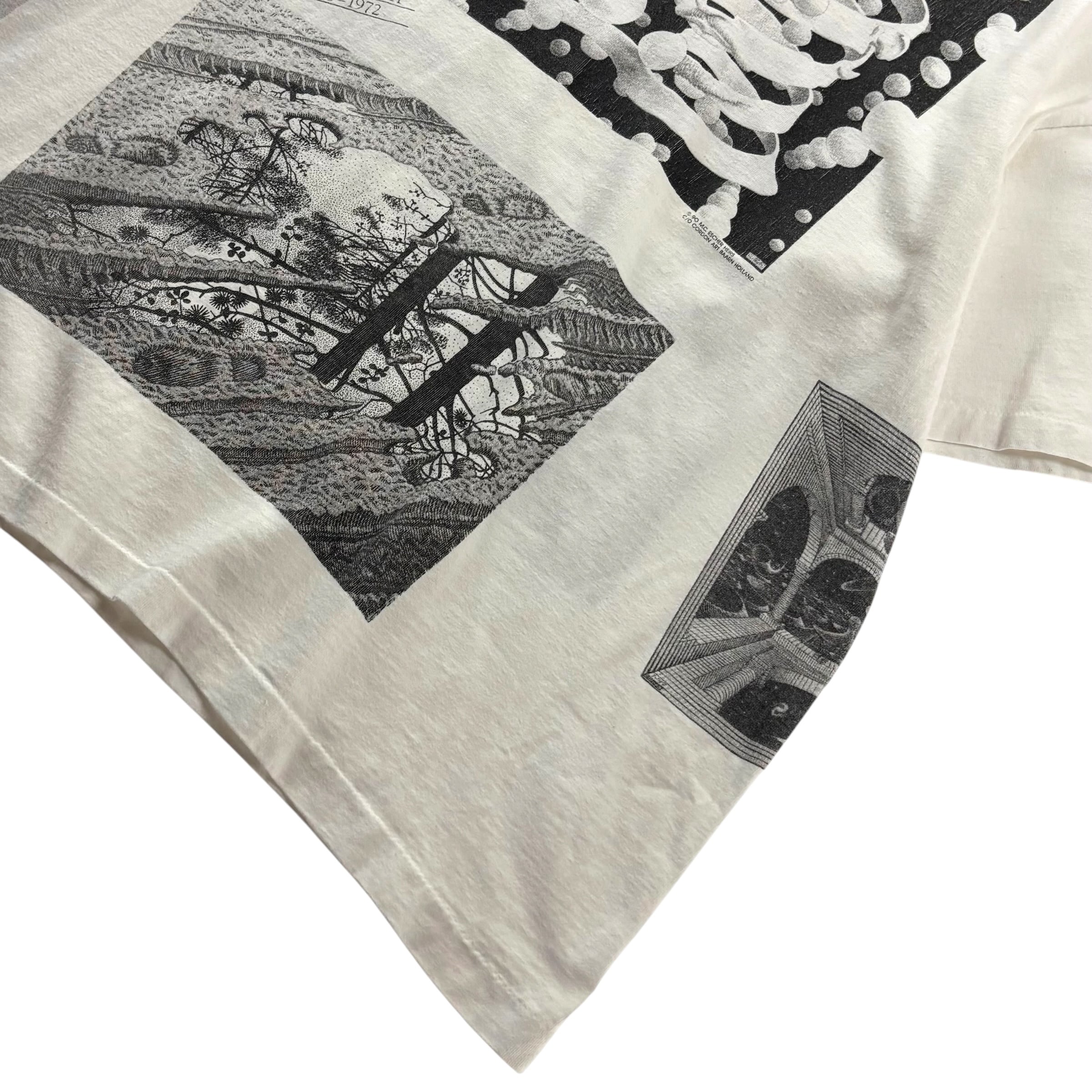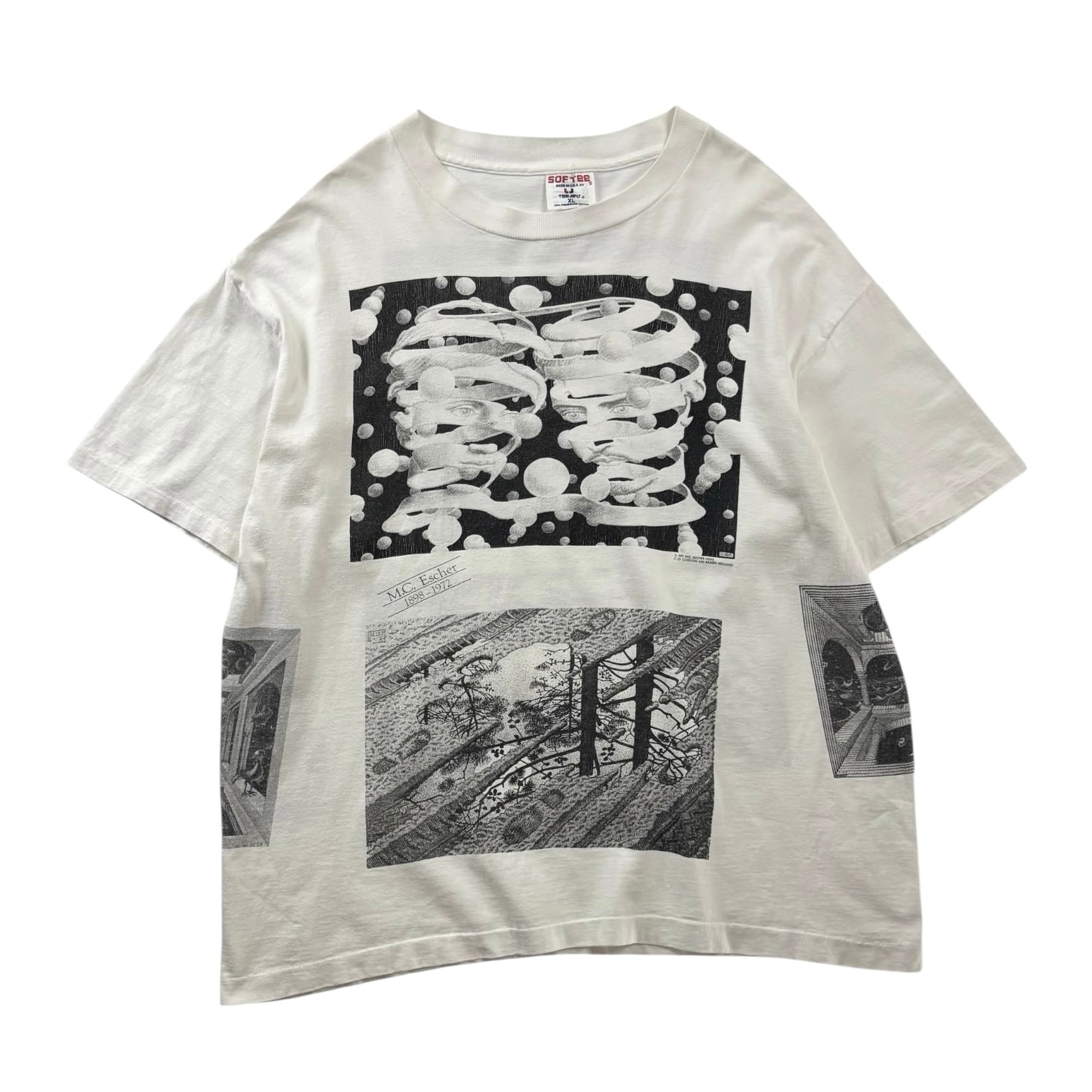 1990's "M.C.ESCHER" S/S Multi Printed T-shirt Made In USA XL (SOF Tee) / 90年代 MCエッシャー マルチプリントTシャツ USA製 ホワイト ソフティー 90s ヴィンテージ ビンテージ シングルステッチ 騙し絵 アートTシャツ