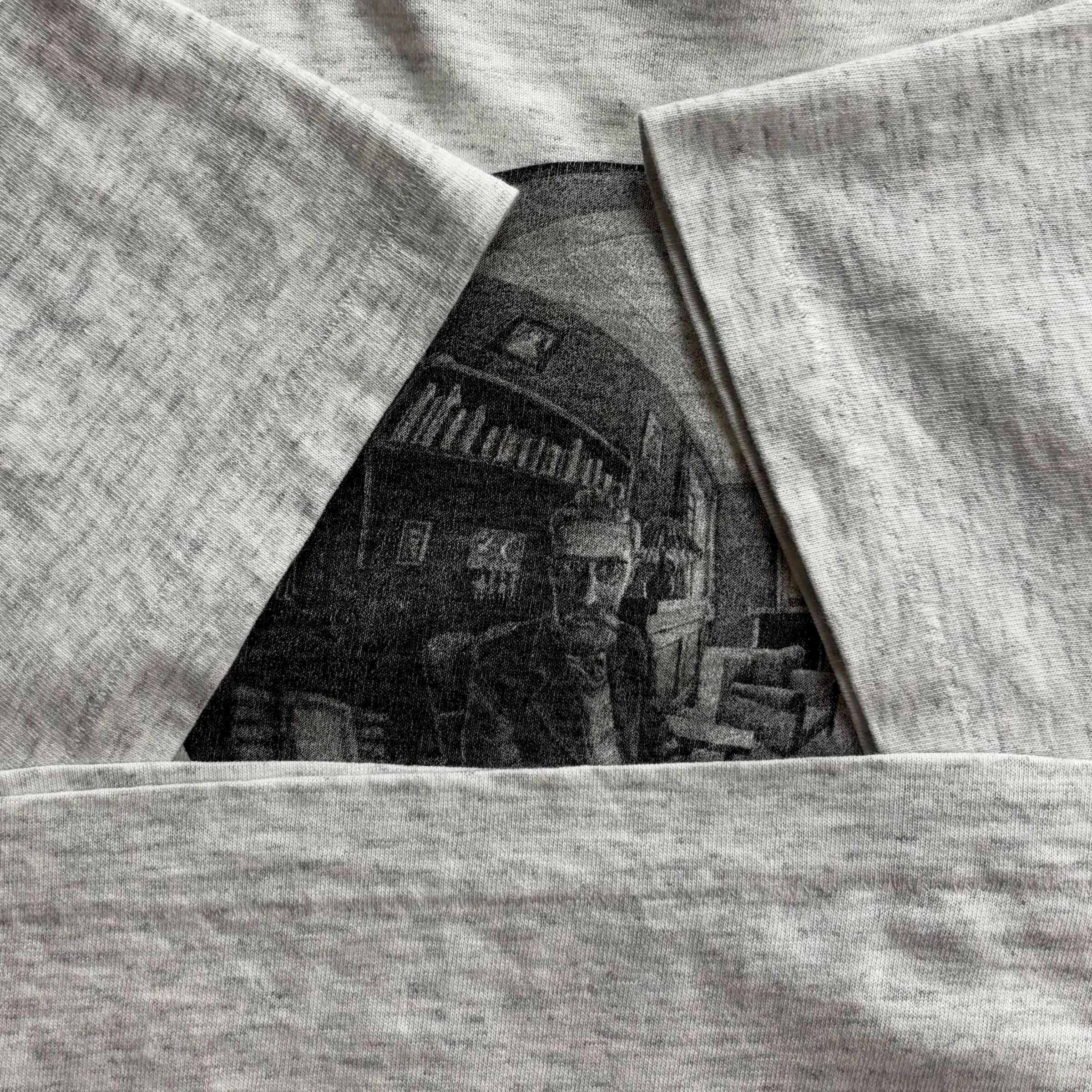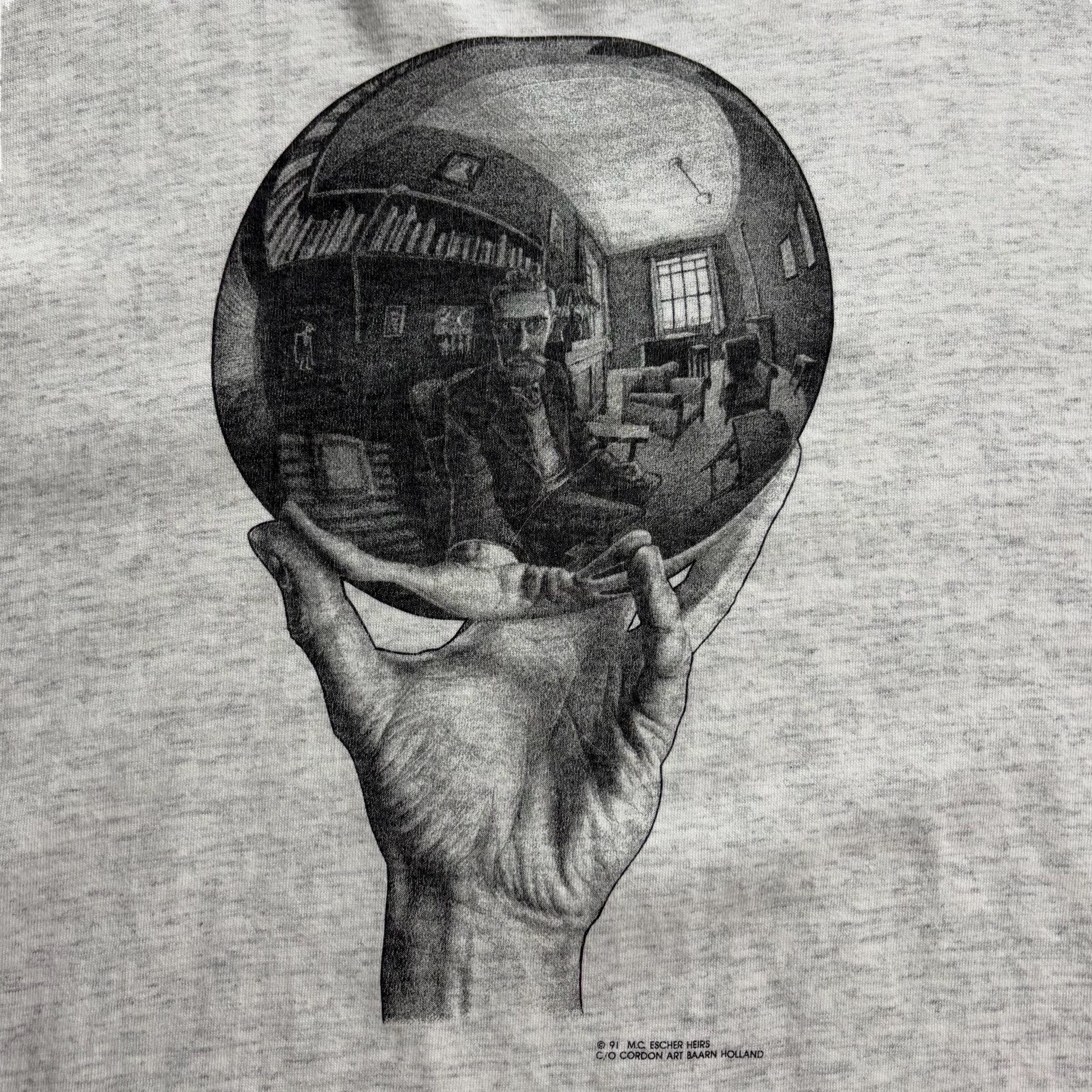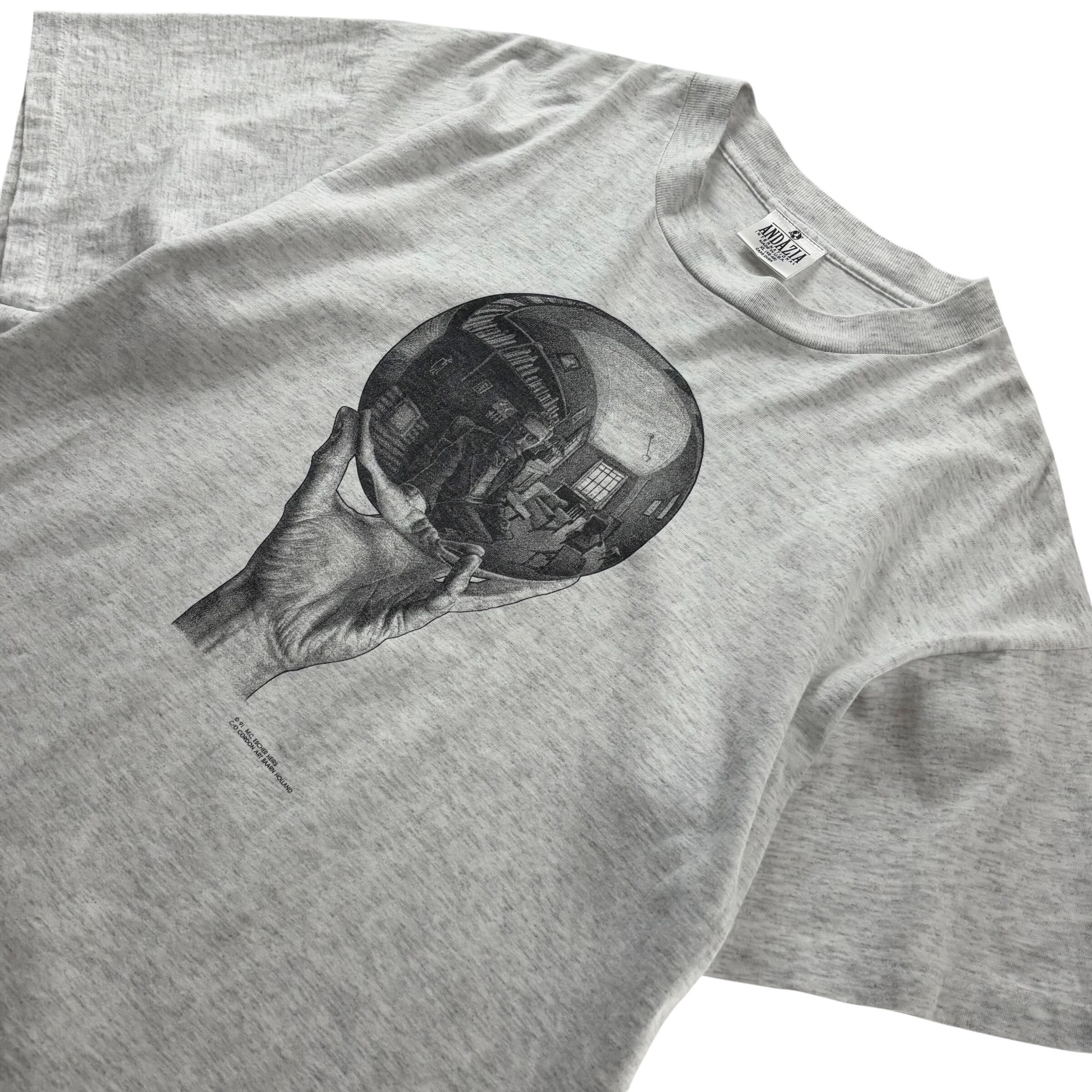 1990's "M.C.ESCHER" S/S Art Printed T-shirt Made In USA XL (ANDAZIA) / 90年代 MCエッシャー アートプリントTシャツ USA製 アッシュグレー アンダジア 90s ヴィンテージ ビンテージ シングルステッチ 反射球を持つ手 騙し絵