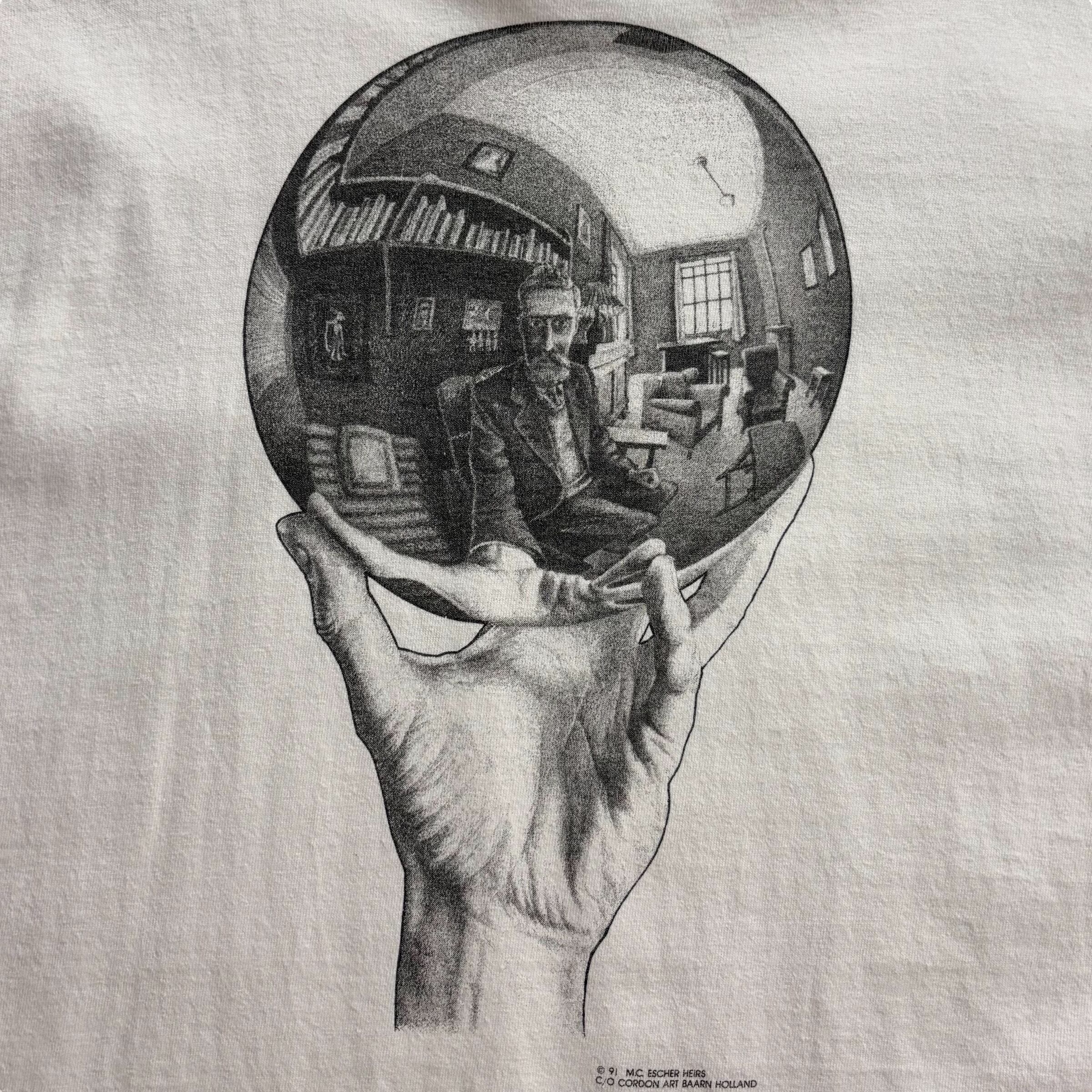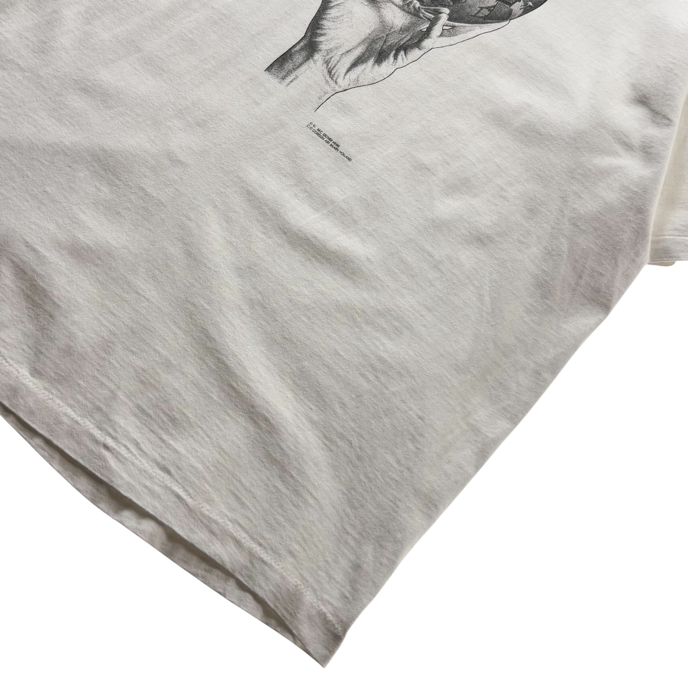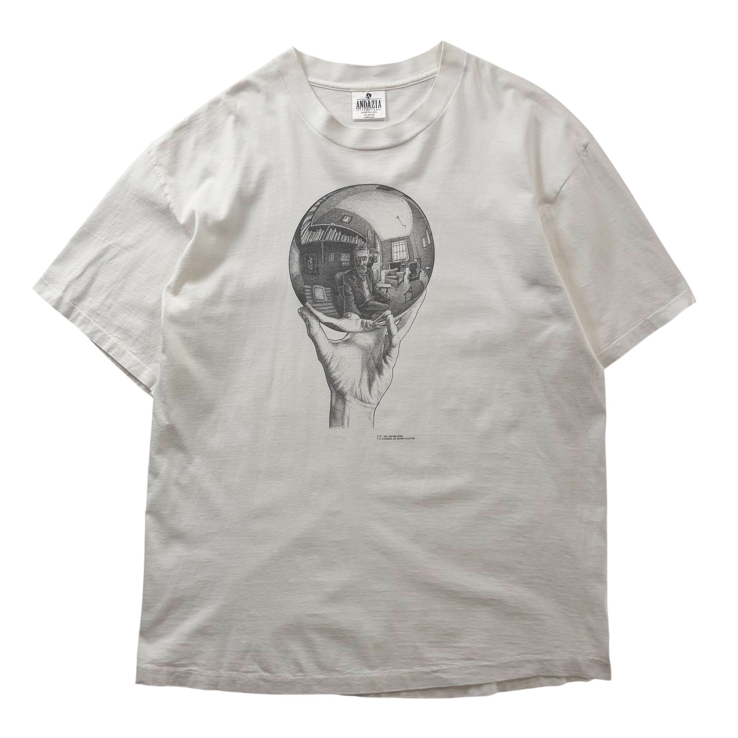 1990's "M.C.ESCHER" S/S Art Printed T-shirt Made In USA XL (ANDAZIA) / 90年代 MCエッシャー アートプリントTシャツ USA製 ホワイト アンダジア 90s ヴィンテージ ビンテージ シングルステッチ 反射球を持つ手 騙し絵