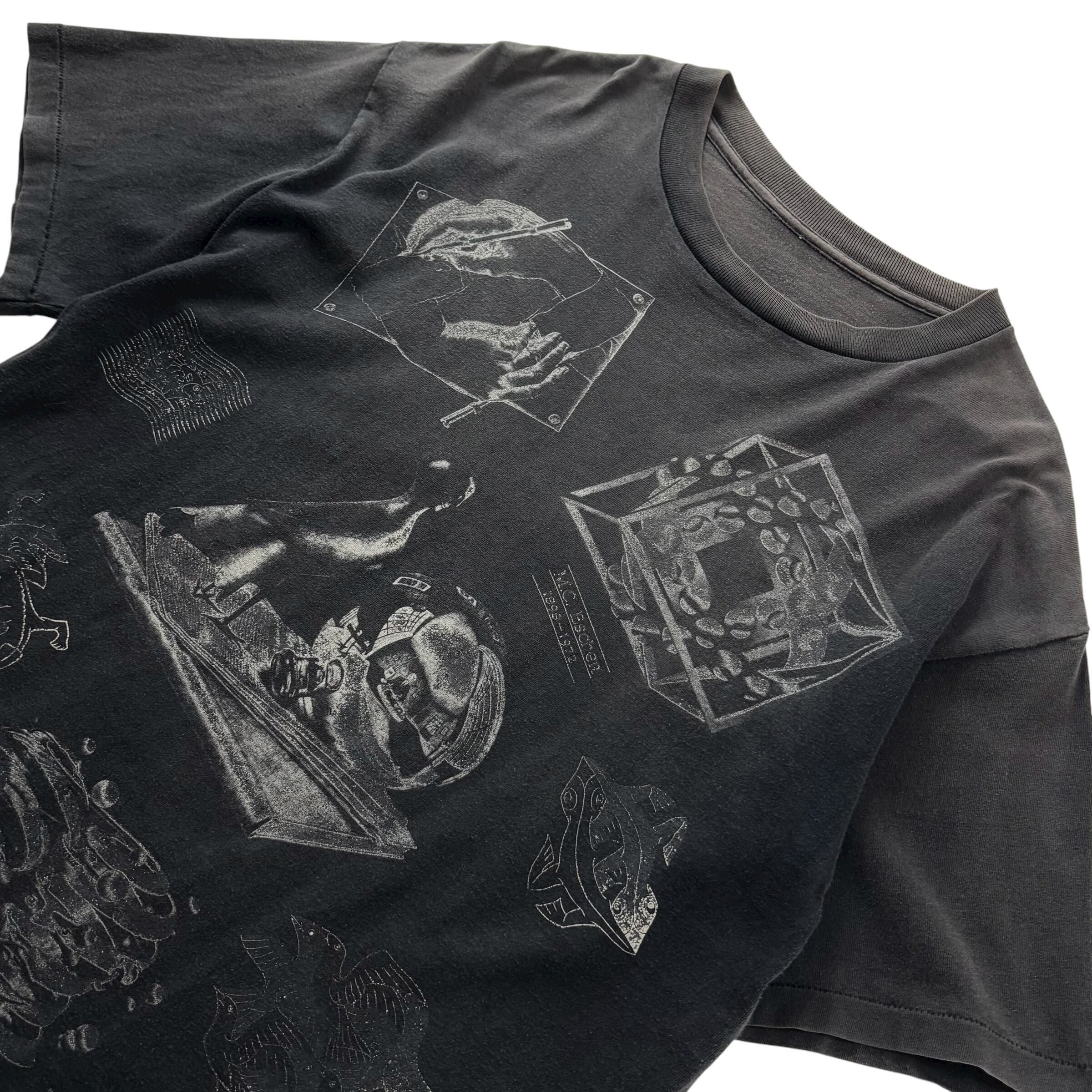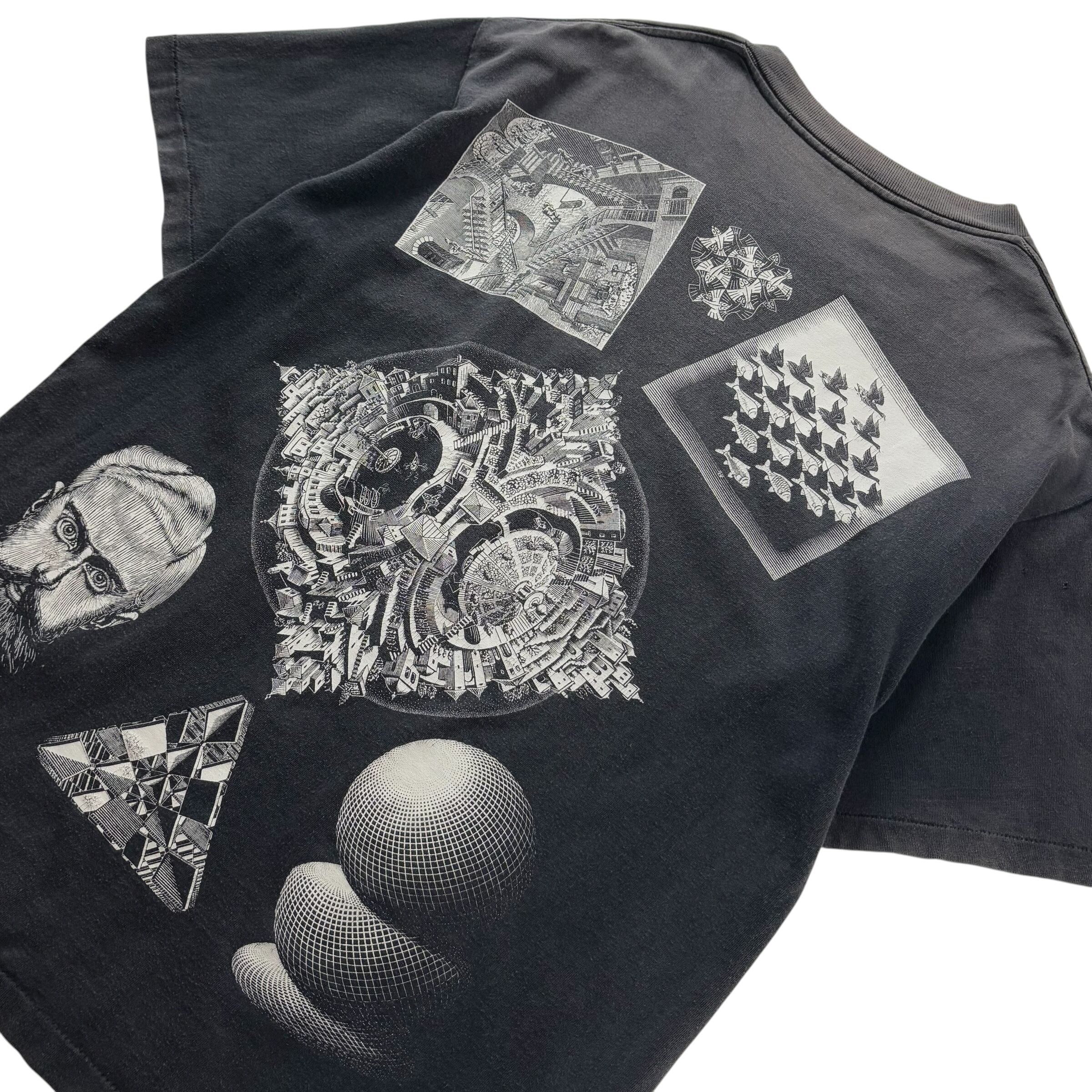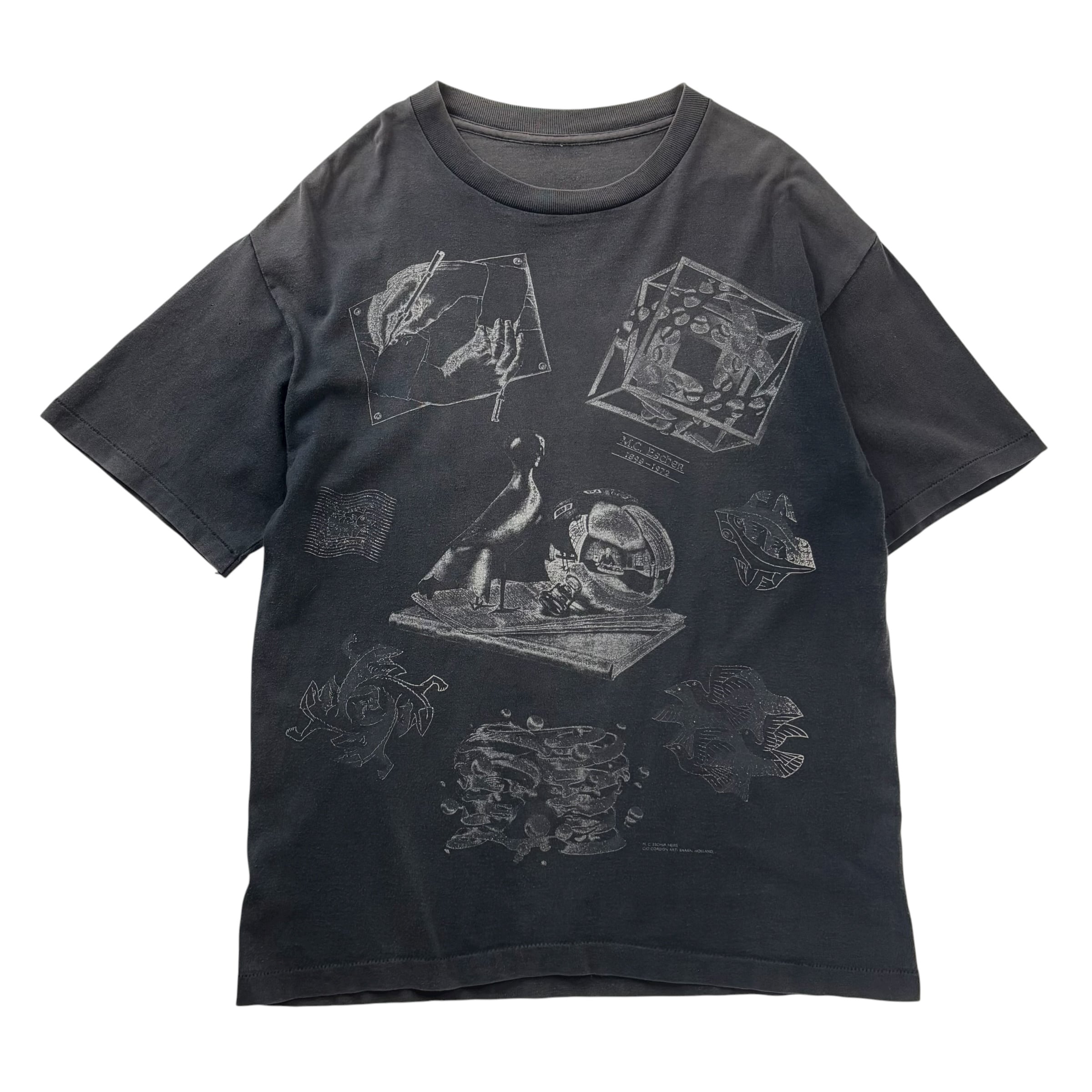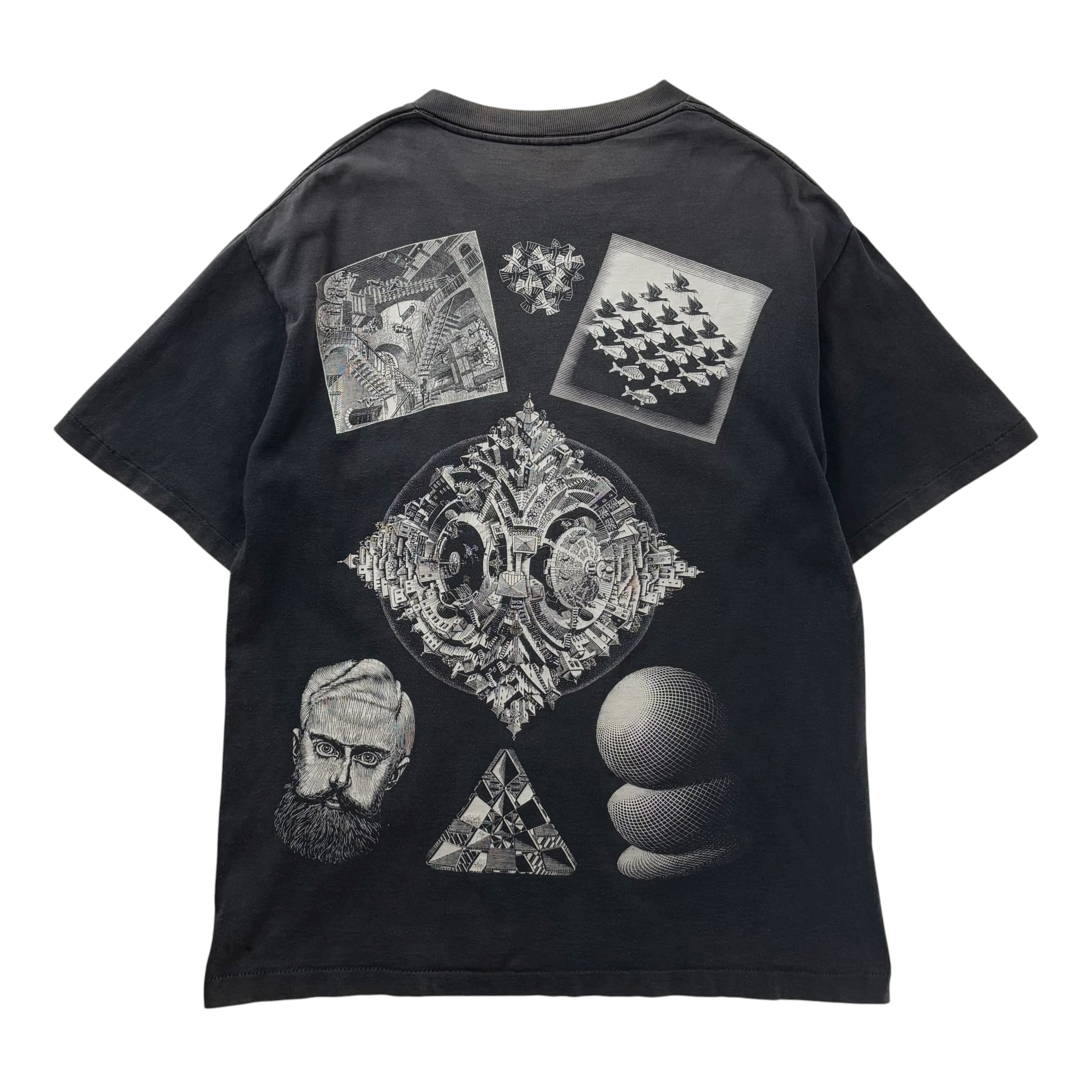 1990's "M.C.ESCHER" S/S Multi Printed T-shirt / 90年代 MCエッシャー マルチプリントTシャツ USA製 ブラック 90s ヴィンテージ ビンテージ シングルステッチ 騙し絵 アートTシャツ サンフェード