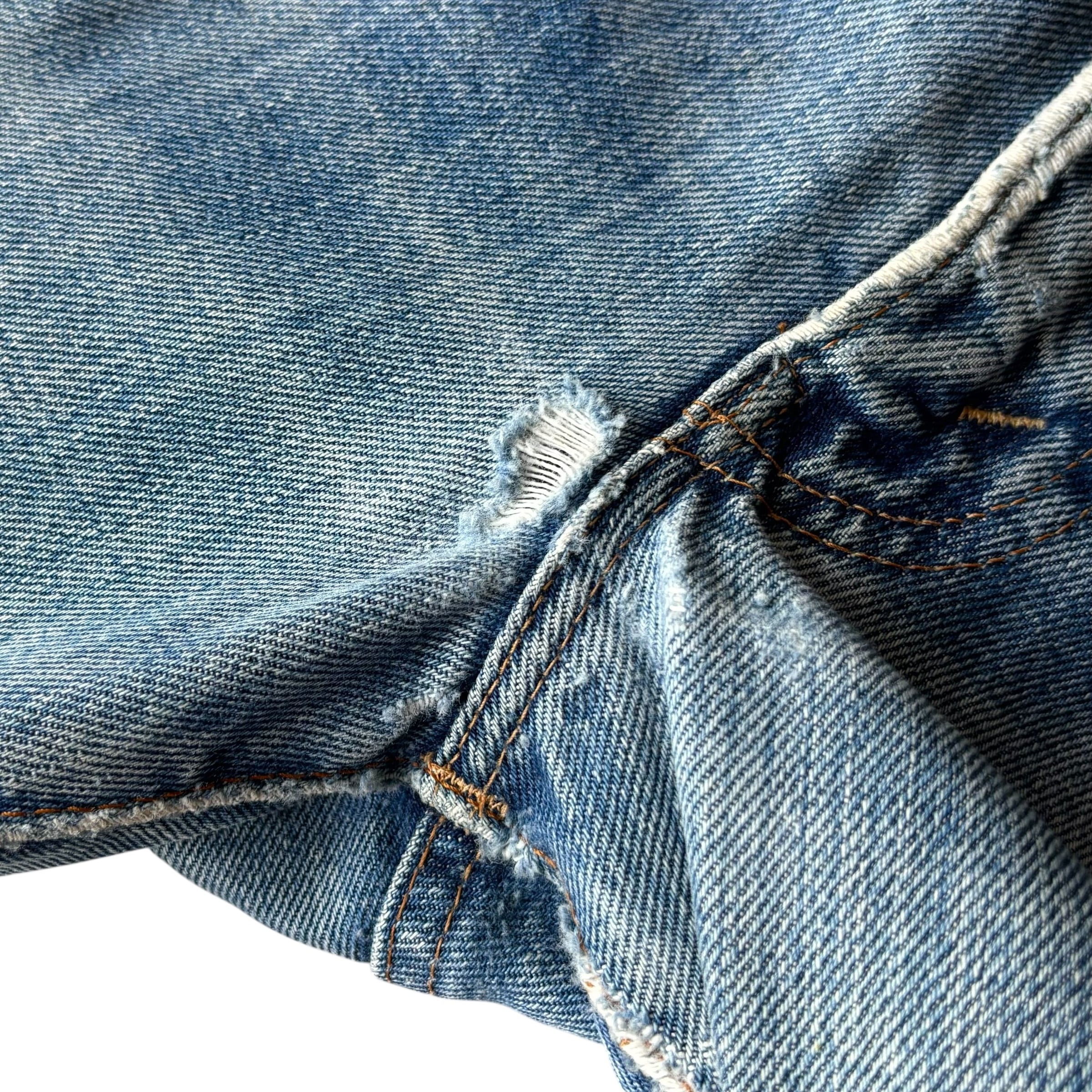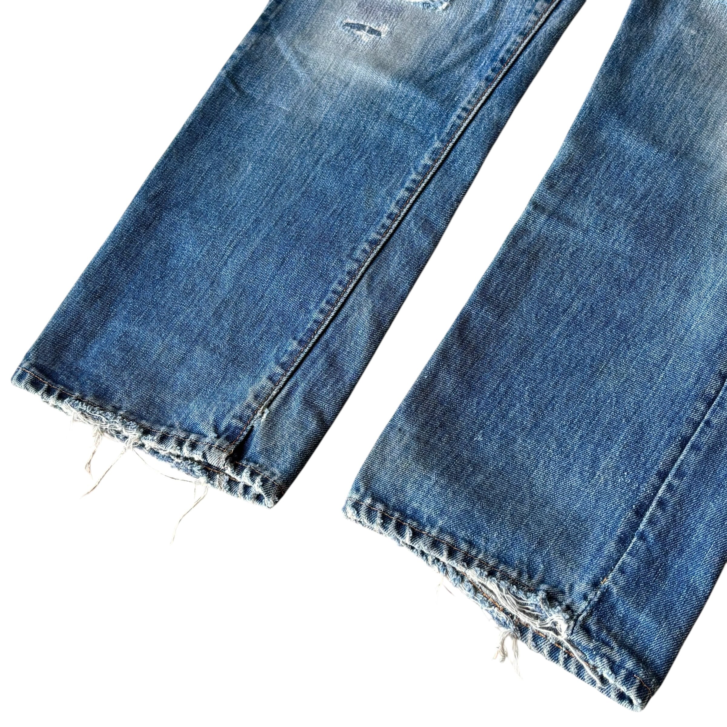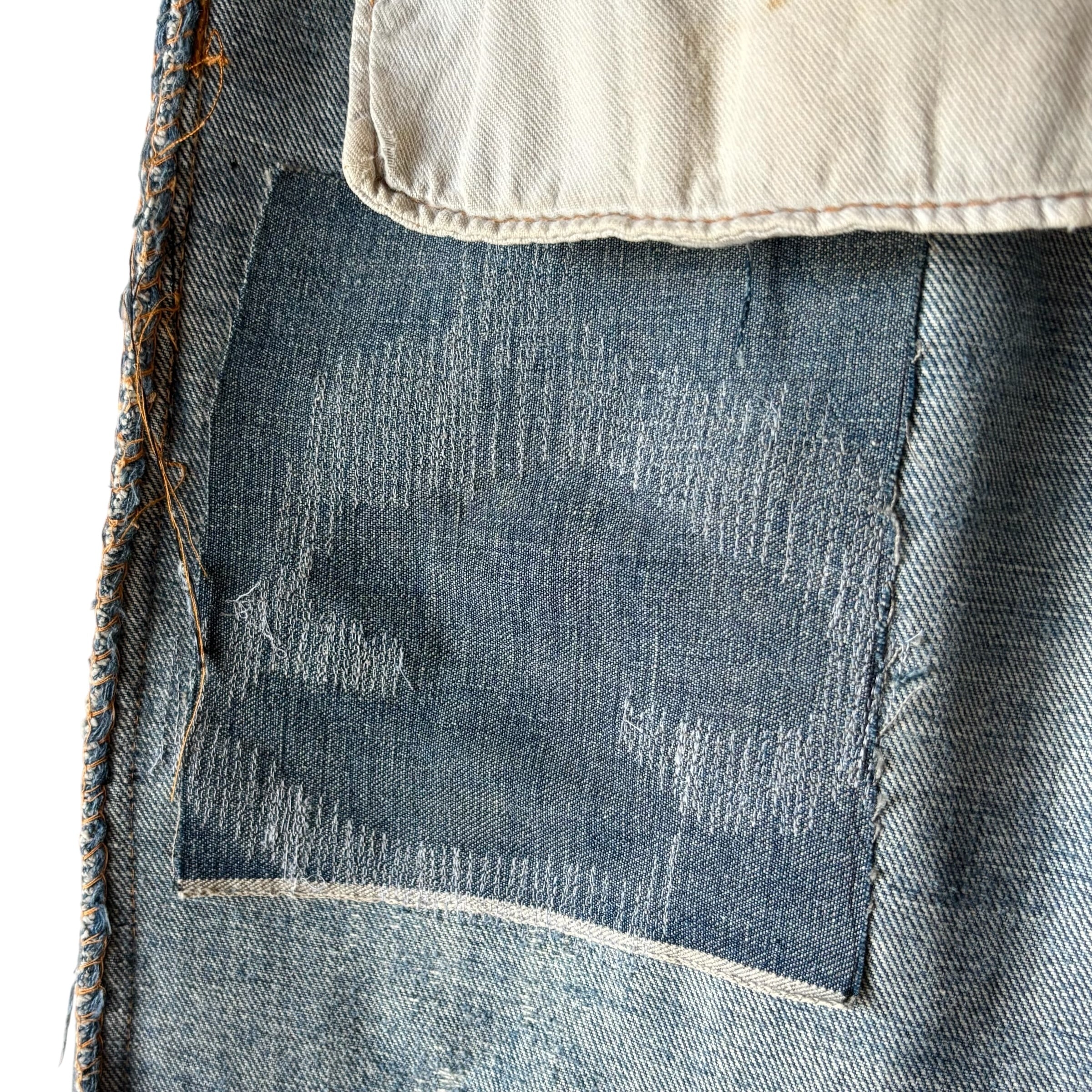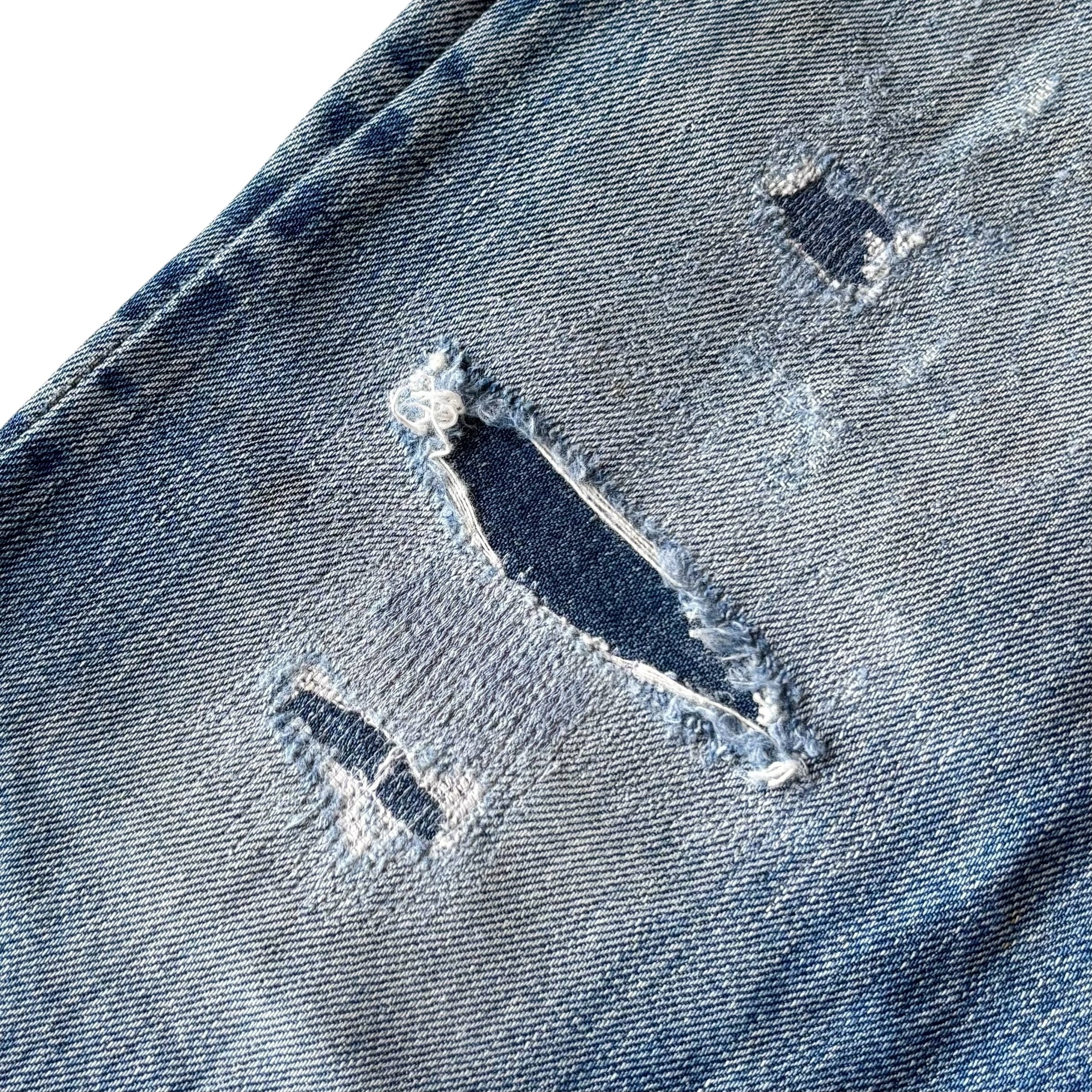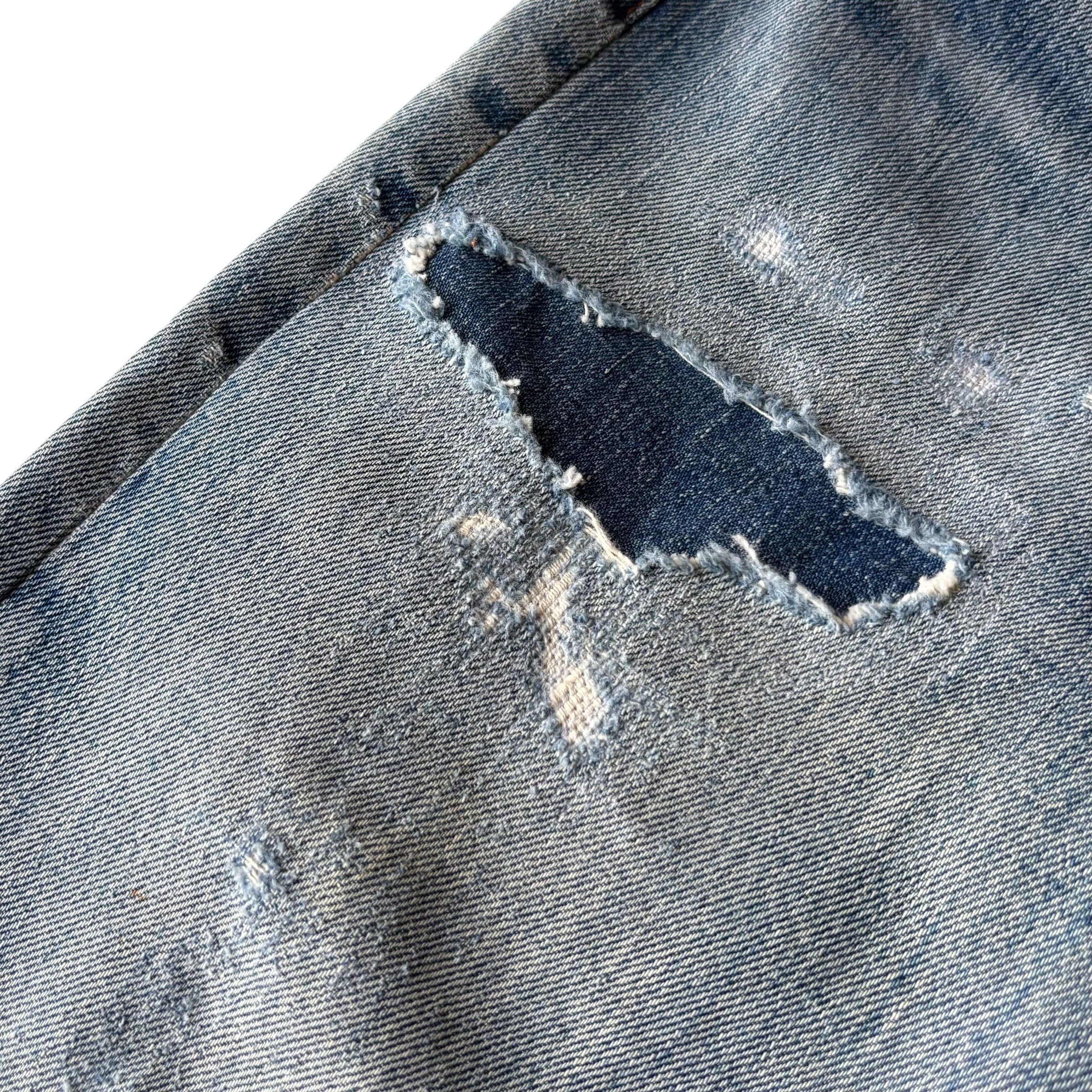 全体的にビンテージデニム特有のリペアやダメージ、微細なほつれ、色の濃淡、薄汚れ等見られます。