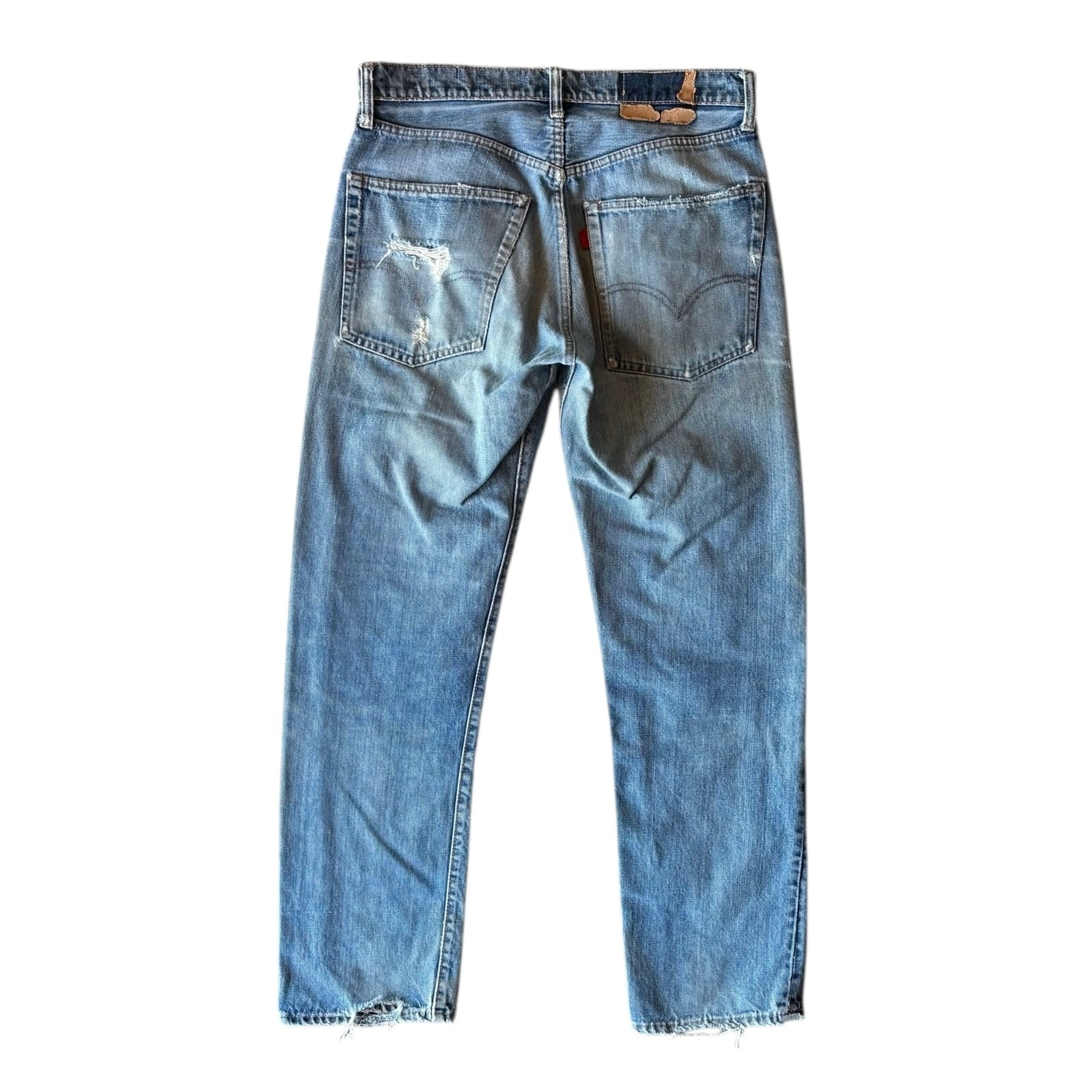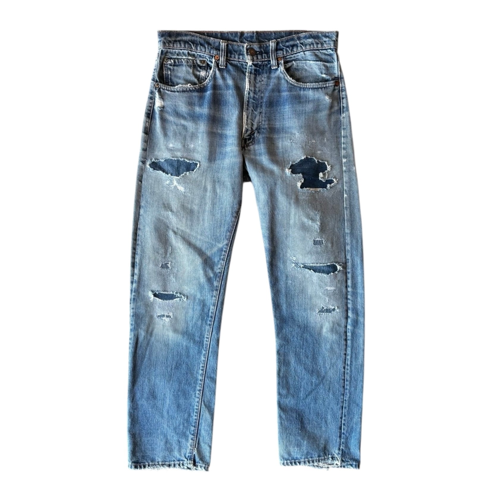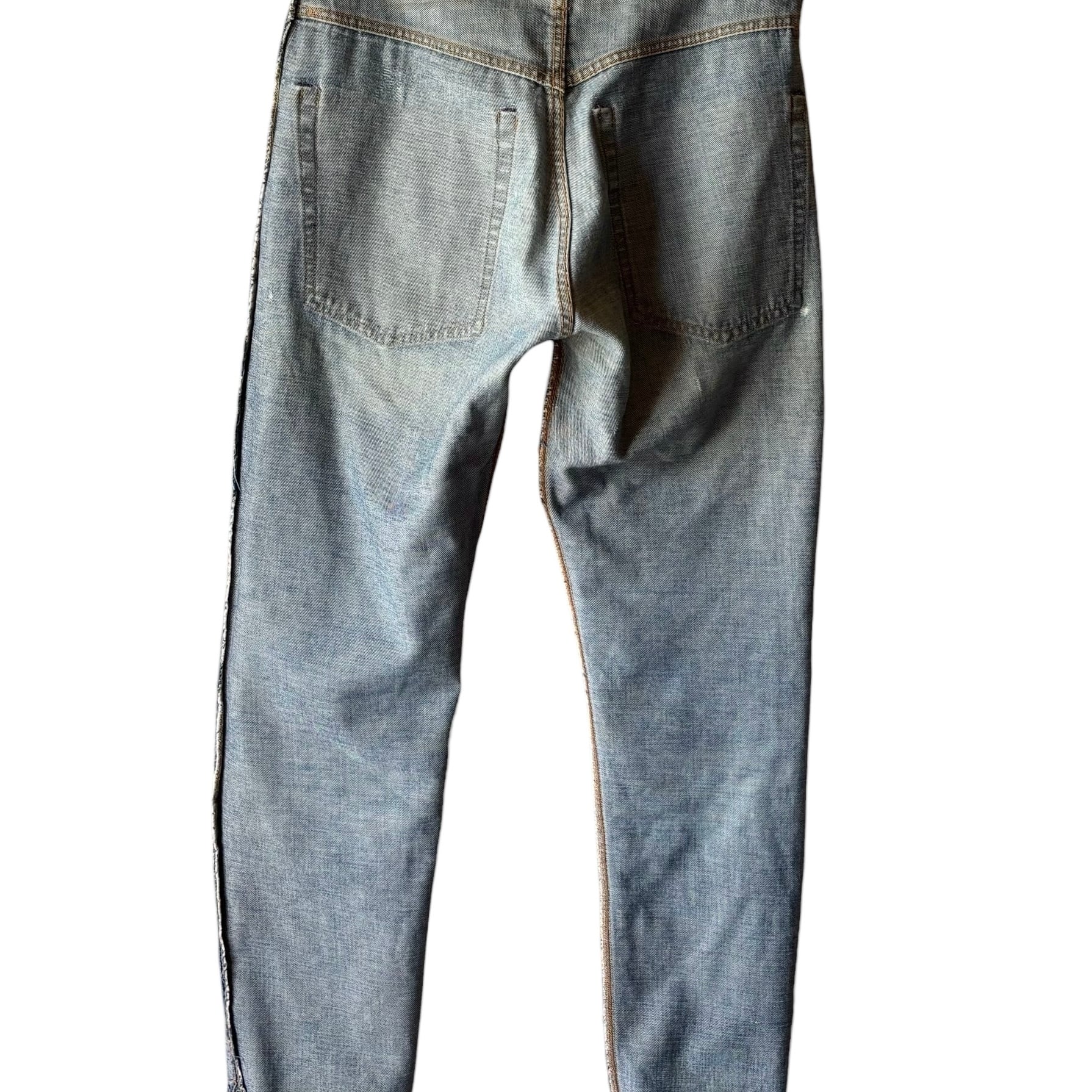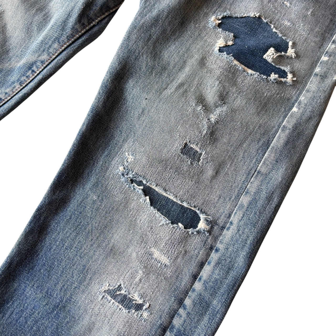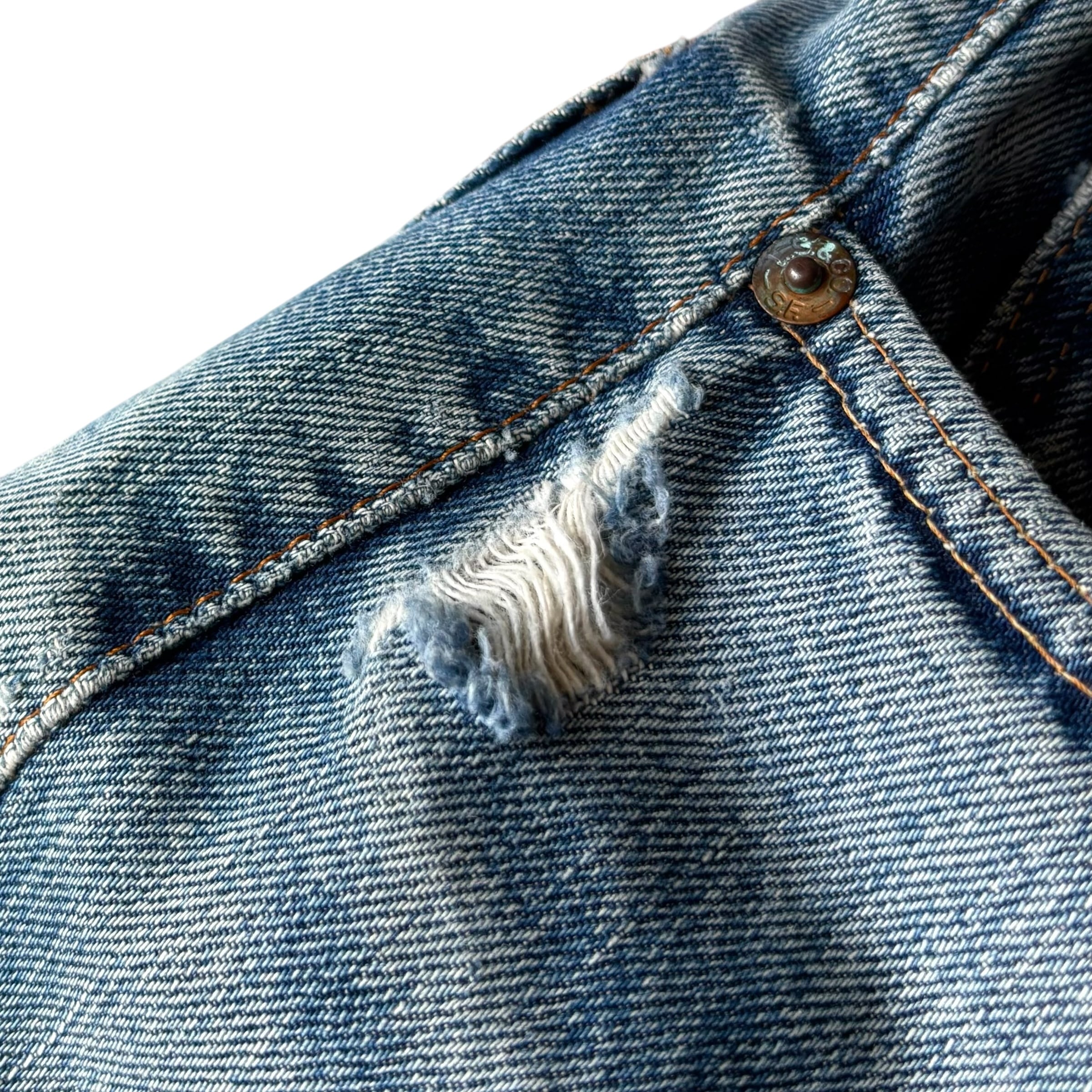 全体的にビンテージデニム特有のリペアやダメージ、微細なほつれ、色の濃淡、薄汚れ等見られます。