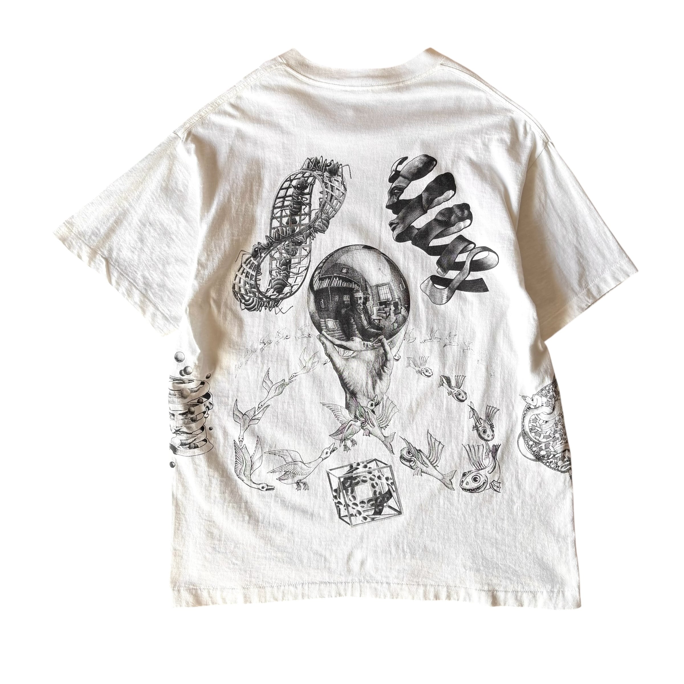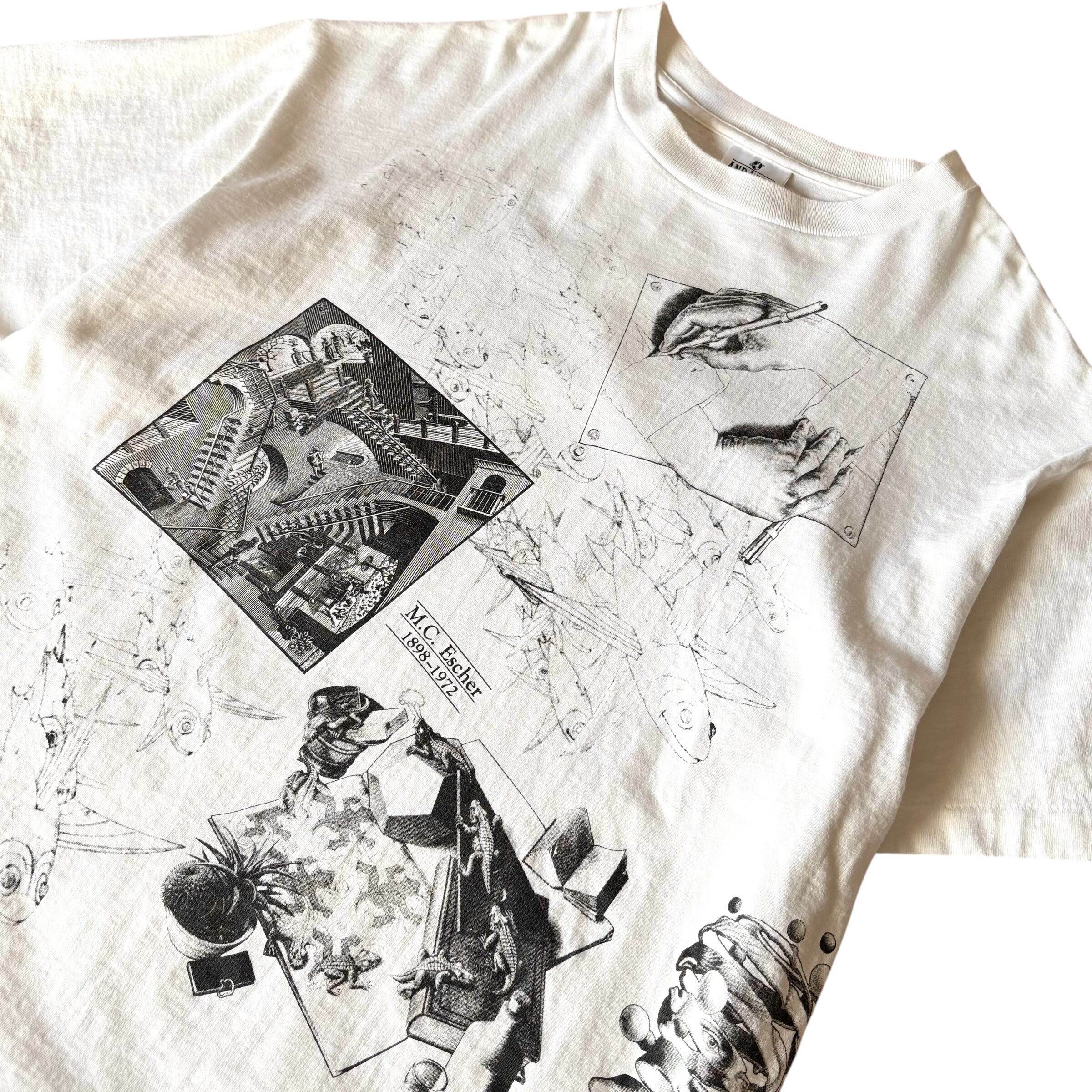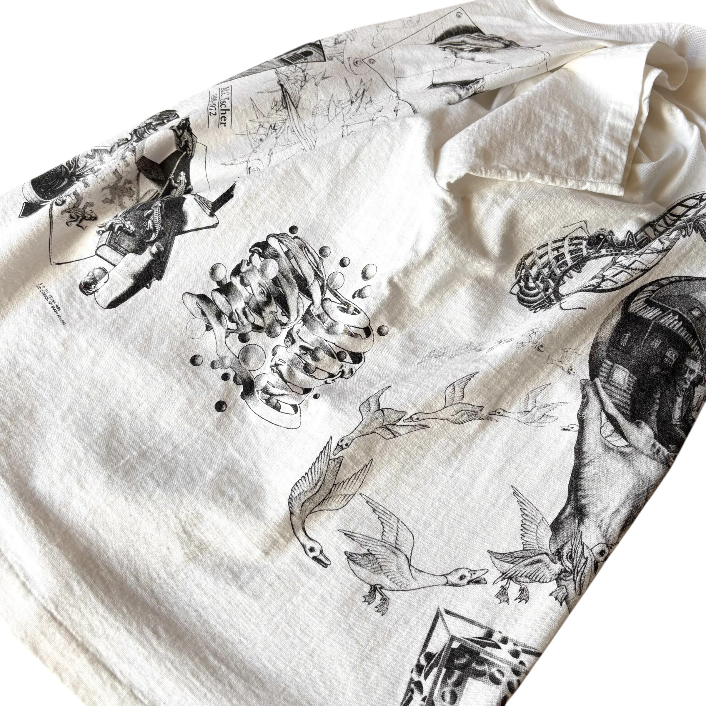 1990's "M.C.ESCHER" S/S Multi Printed T-shirt Made In USA XL (ANDAZIA) / 90年代 MCエッシャー マルチプリントTシャツ USA製 ホワイト アンダジア 90s ヴィンテージ ビンテージ シングルステッチ 騙し絵 アートTシャツ