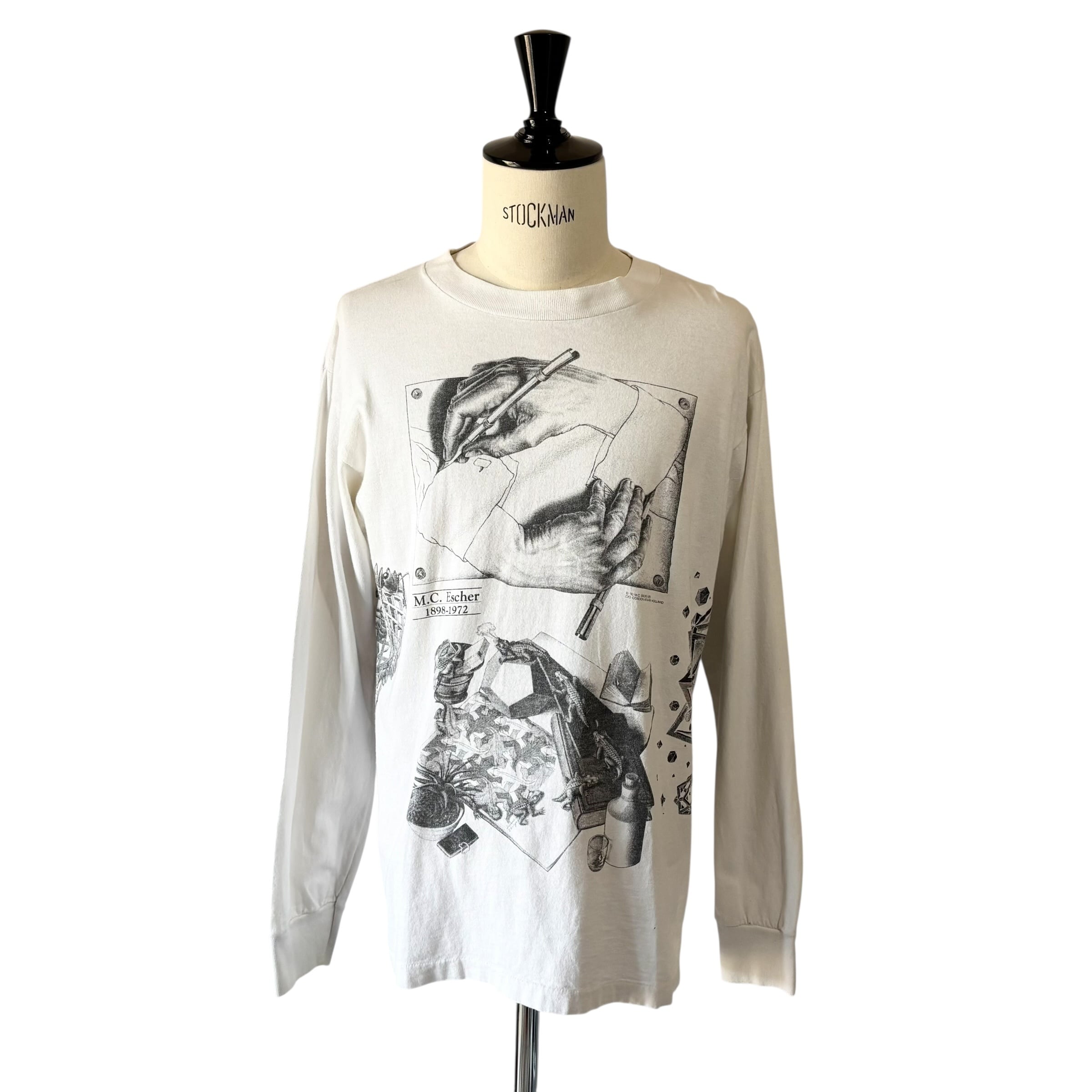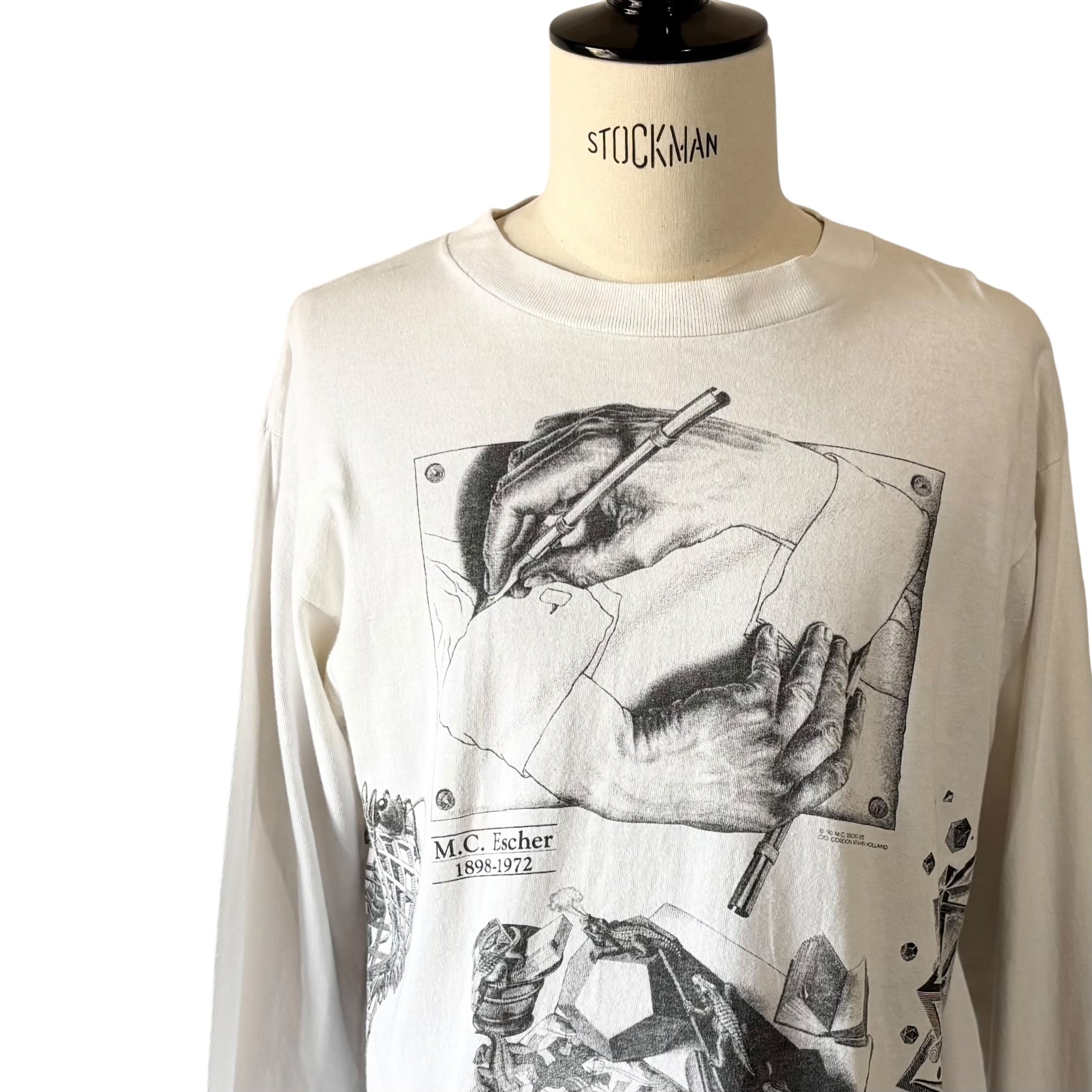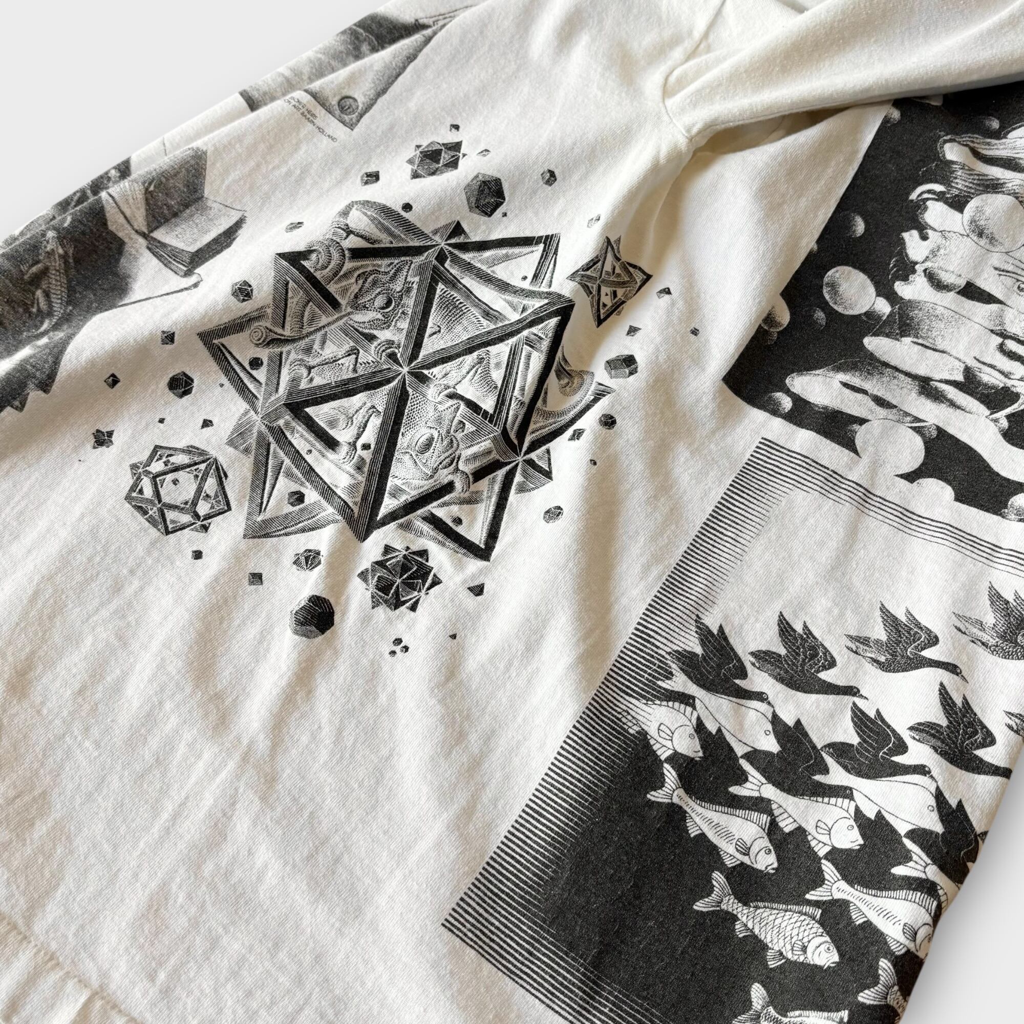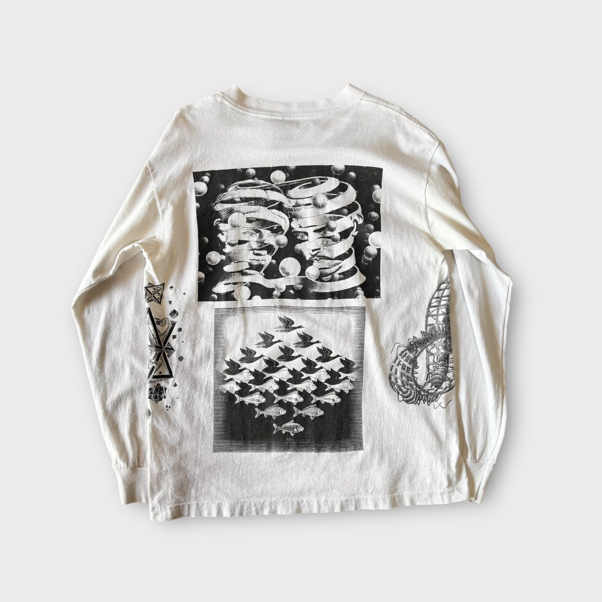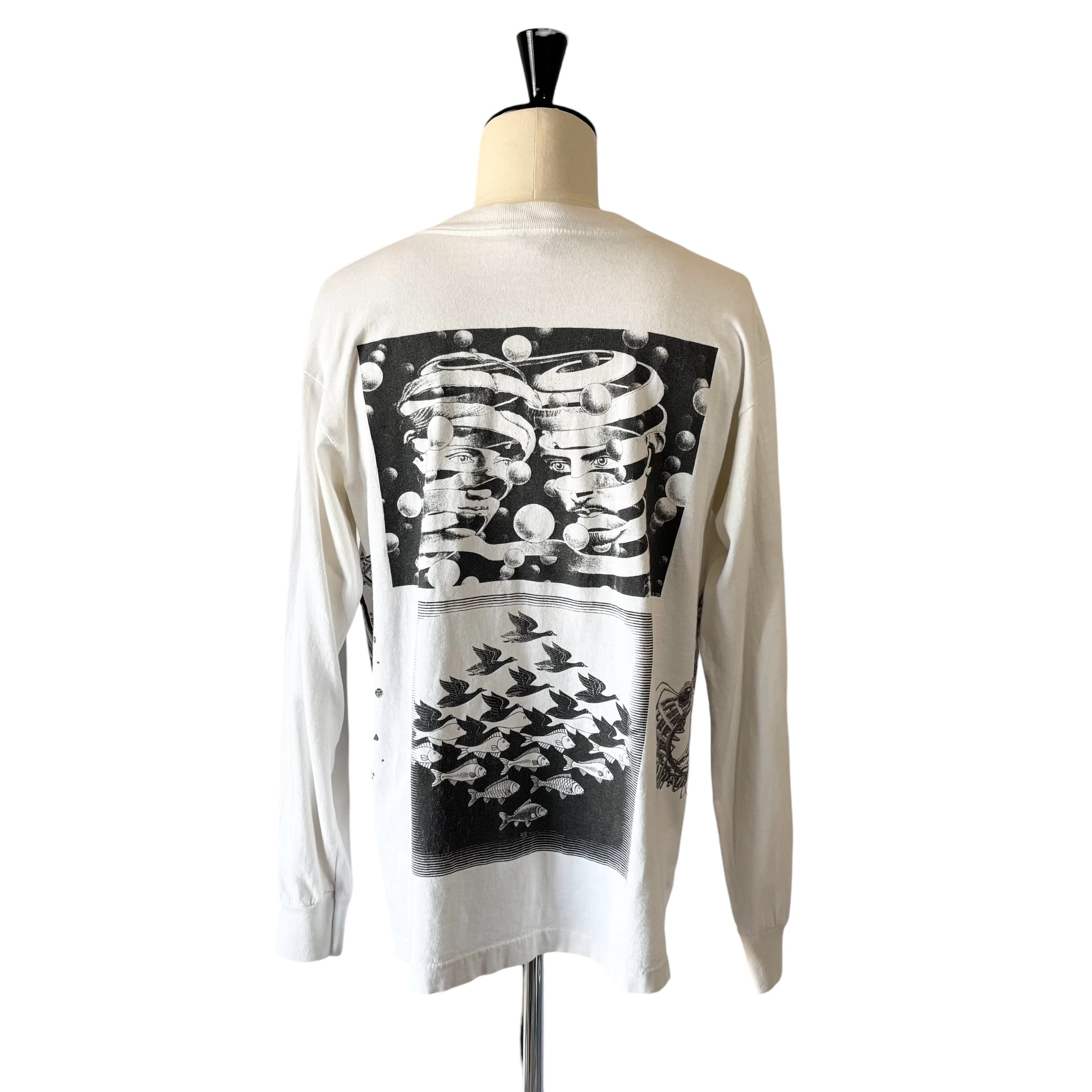 1990's "M.C.ESCHER" L/S Multi Printed T-shirt Made In USA L (ONEITA) / 90年代 MCエッシャー 長袖 マルチプリントTシャツ USA製 ホワイト オニータ 90s ヴィンテージ ビンテージ シングルステッチ 騙し絵 アートTシャツ ロンT