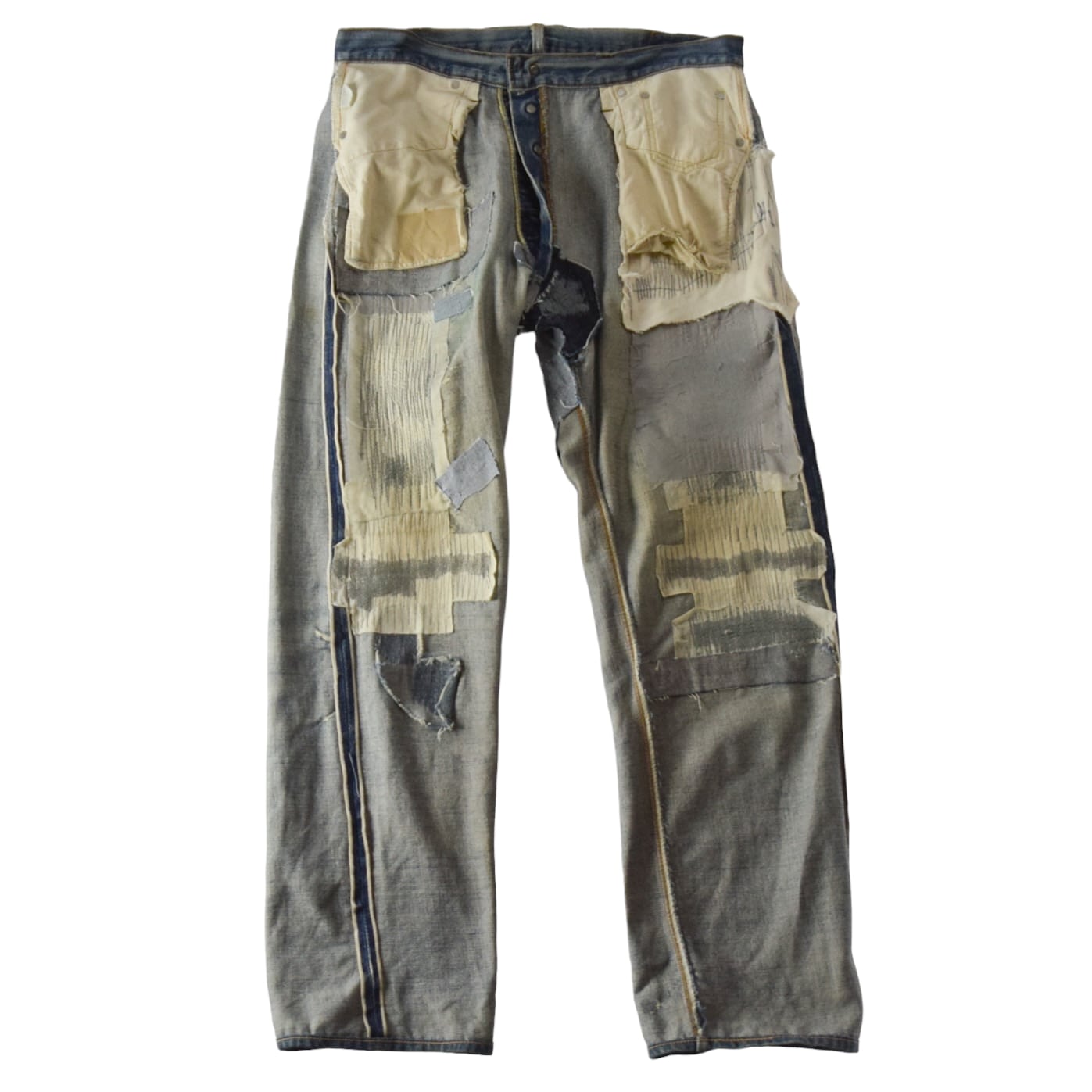 着用に支障はございませんが、全体的にリペアやダメージ、擦れやホツレ、色の濃淡が見られます。画像でご確認くださいませ。雰囲気系の古着にご理解のる方のみお願いします。
