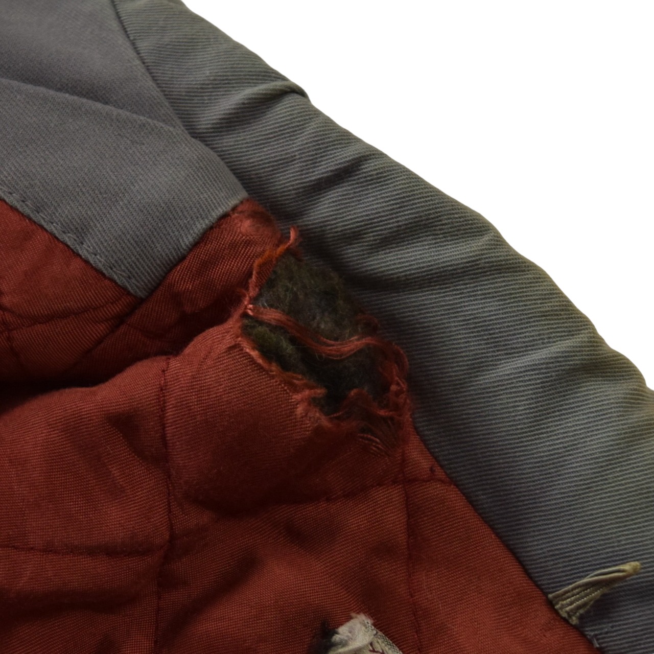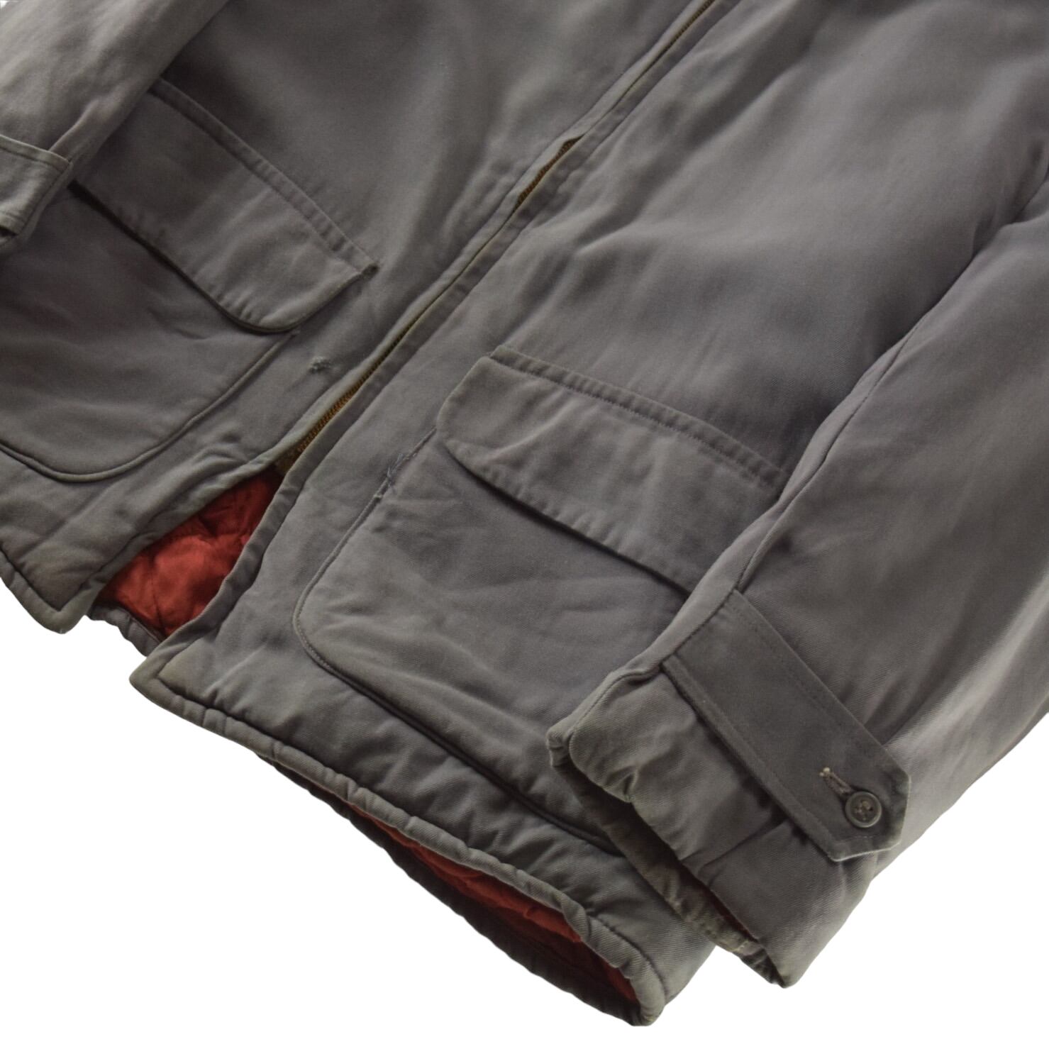 裏地にダメージ、襟に薄汚れ、フロント、左バック脇下小傷、右袖薄汚れ、左脇裾擦れが見られます。
