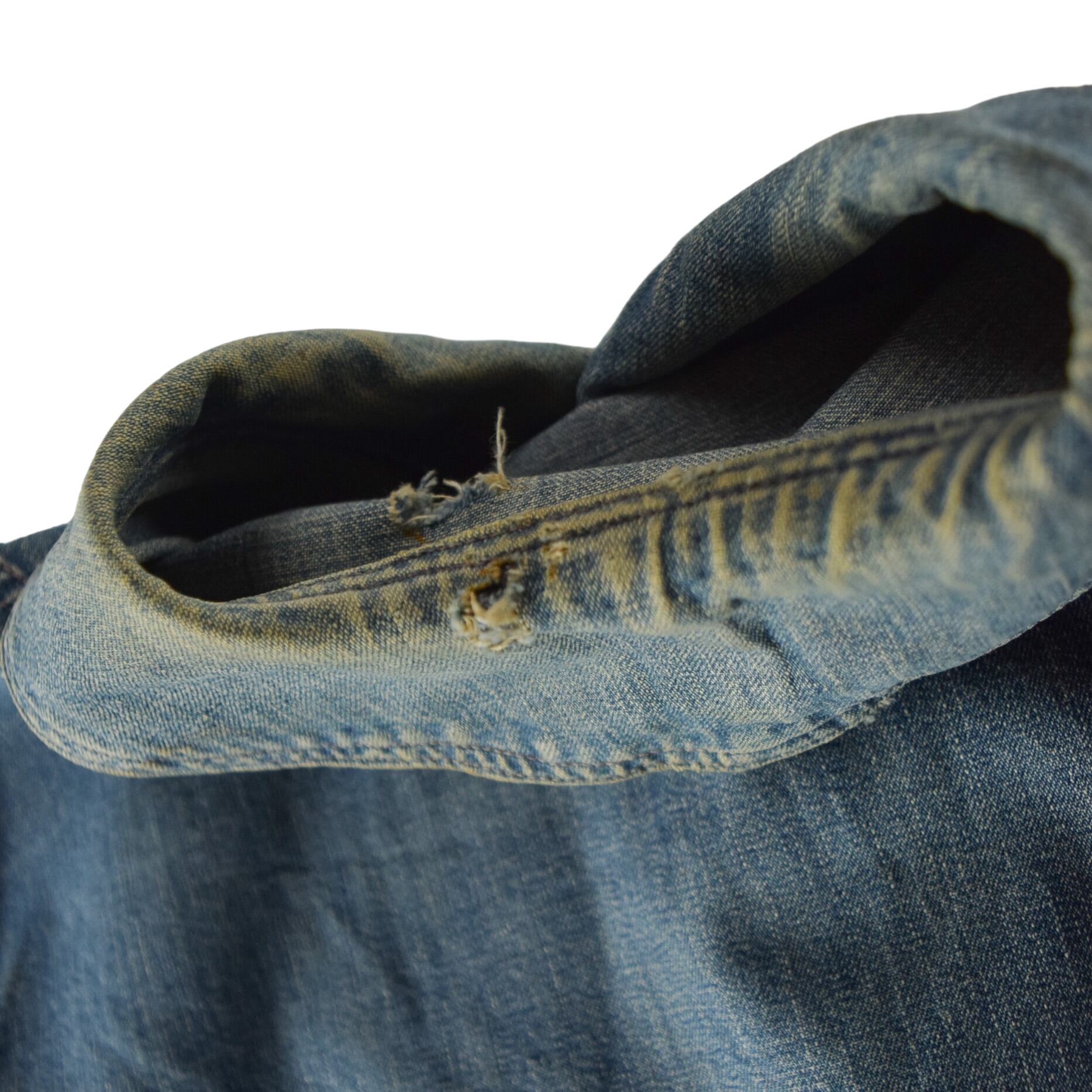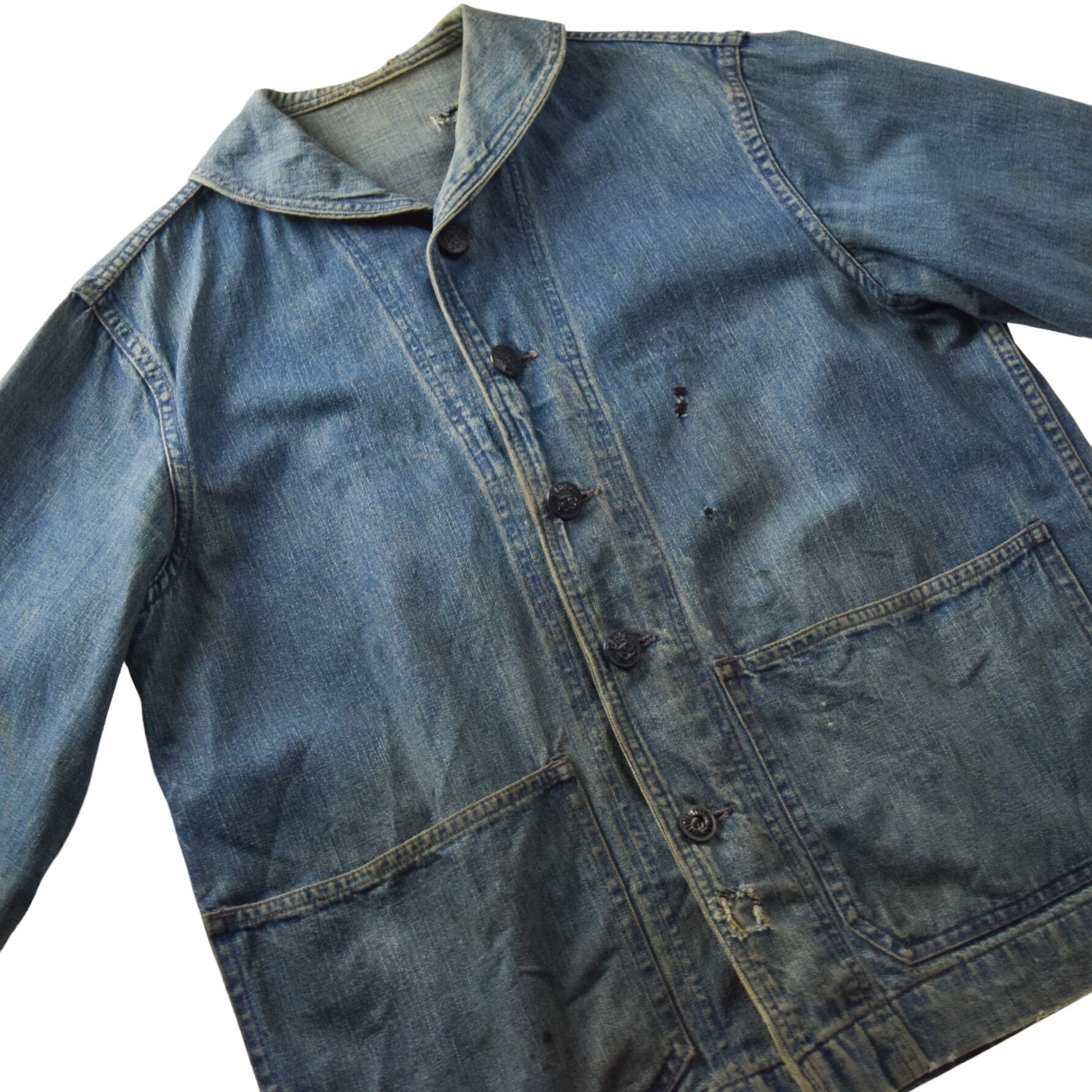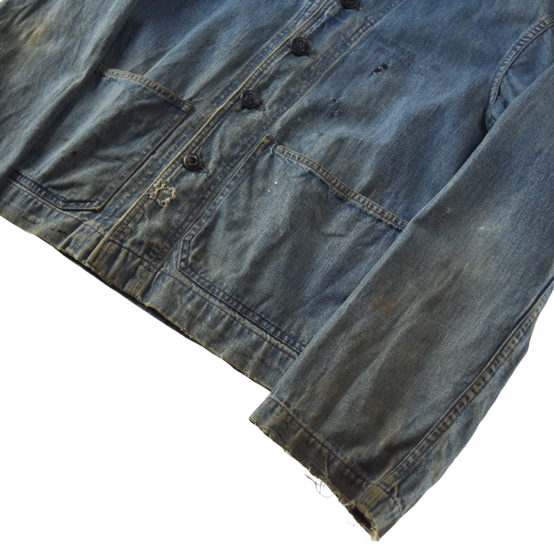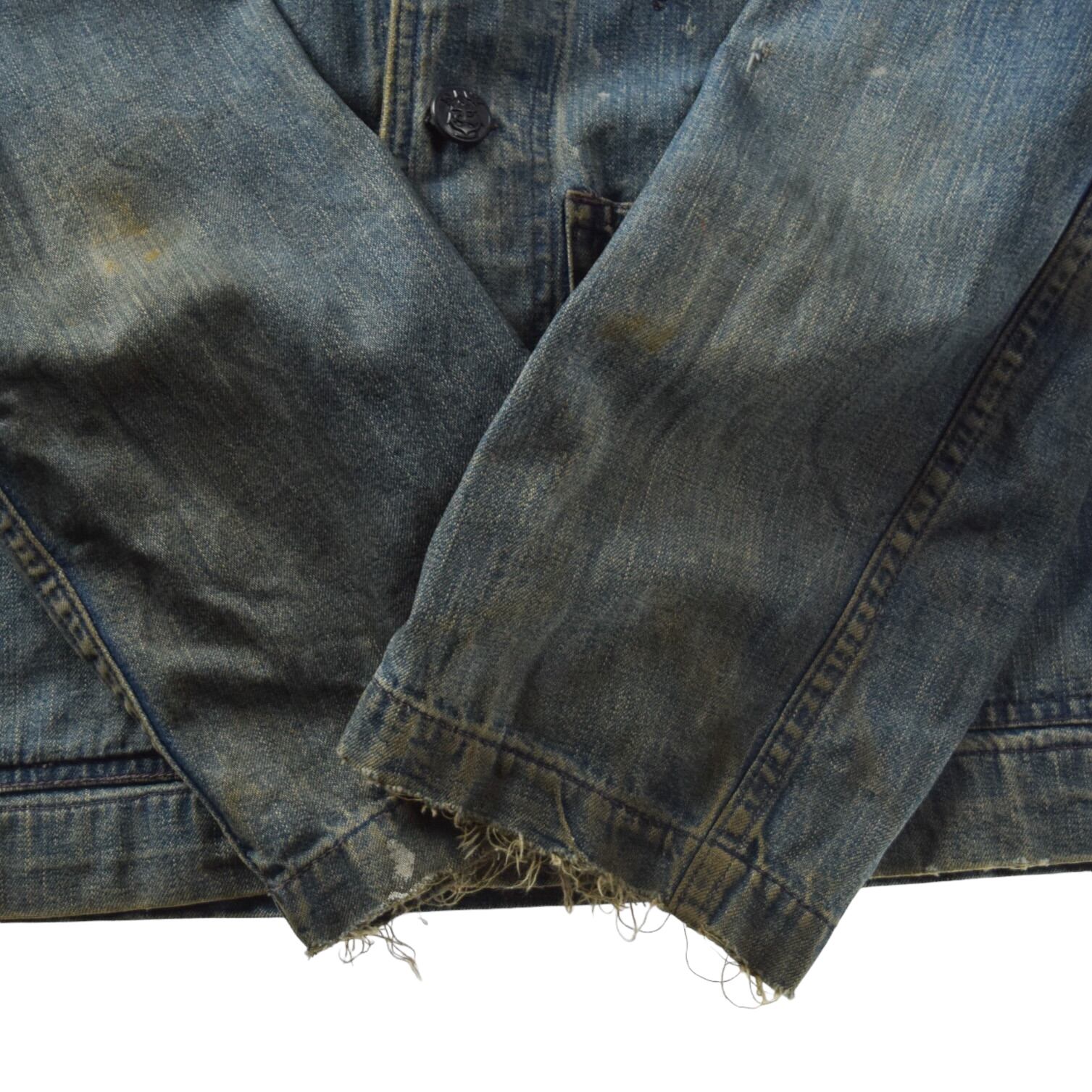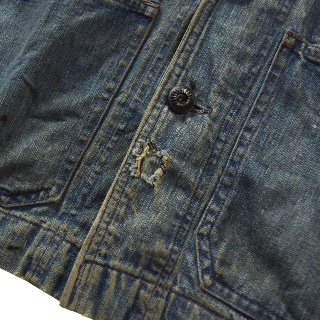 一番下のボタンが前オーナーにより付け替えられています。また、袖先に擦れ、部分的にリペアや小傷、薄汚れ、軽微なホツレ、全体的ヴィンテージデニム特有の色の濃淡が見られます。