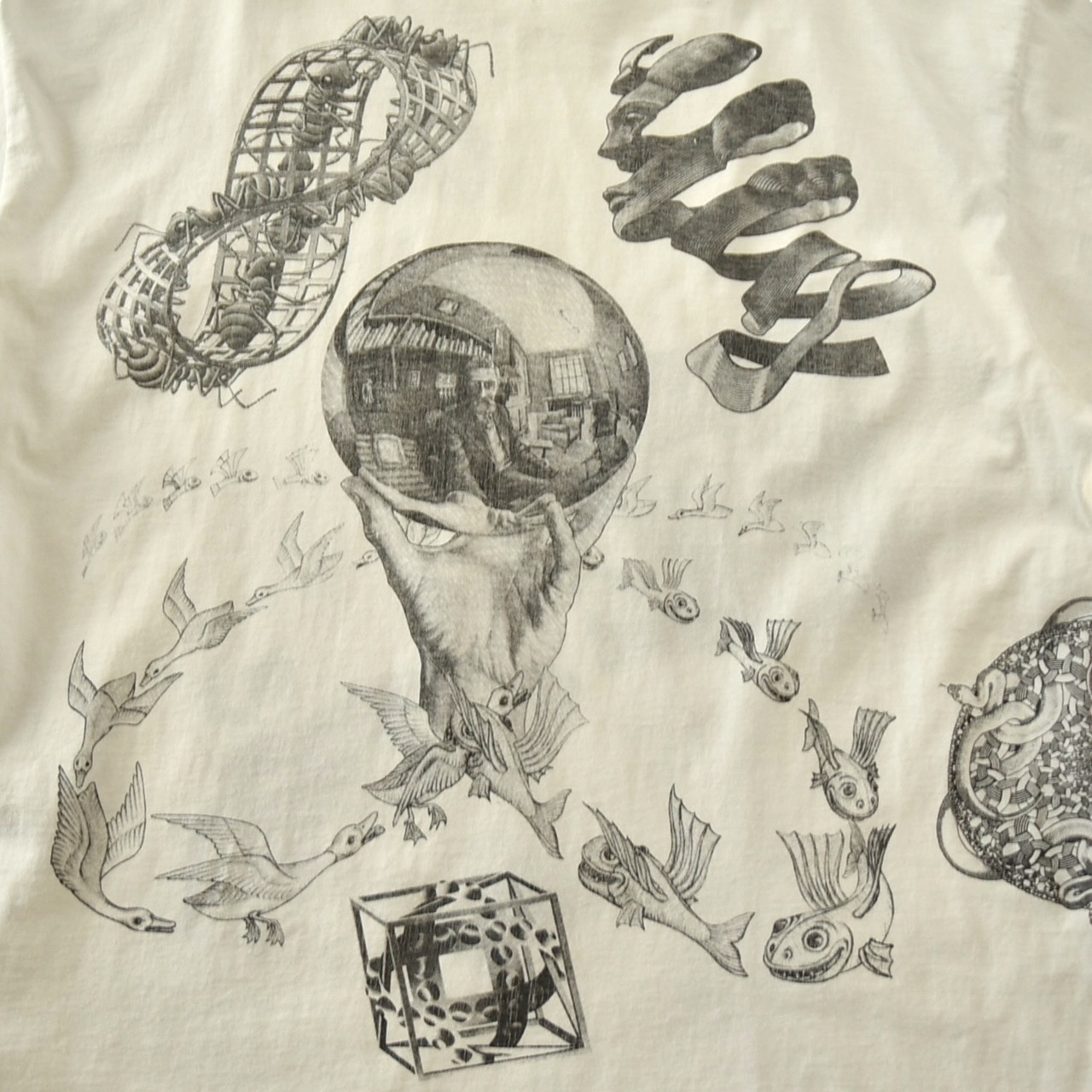 1990's "M.C.Escher" S/S Vintage Art Printed T-shirt XL Made In USA (ANDAZIA) / 90年代 MCエッシャー ヴィンテージ マルチプリントTシャツ USA製 シングルステッチ アンダジア 90s ビンテージ アートT 描く手